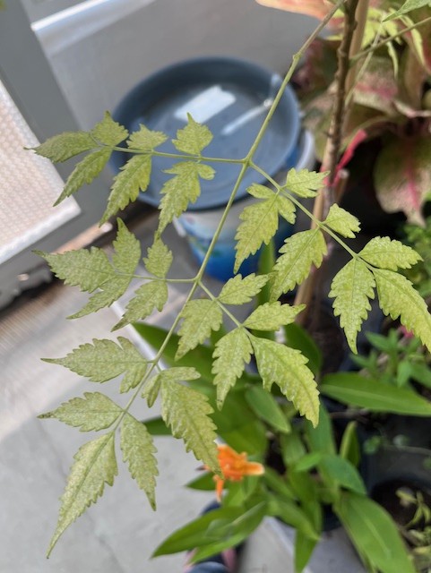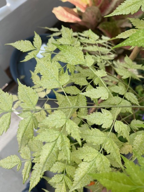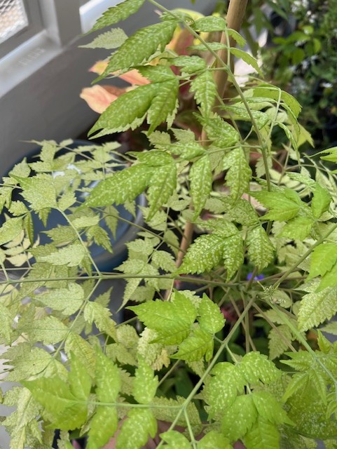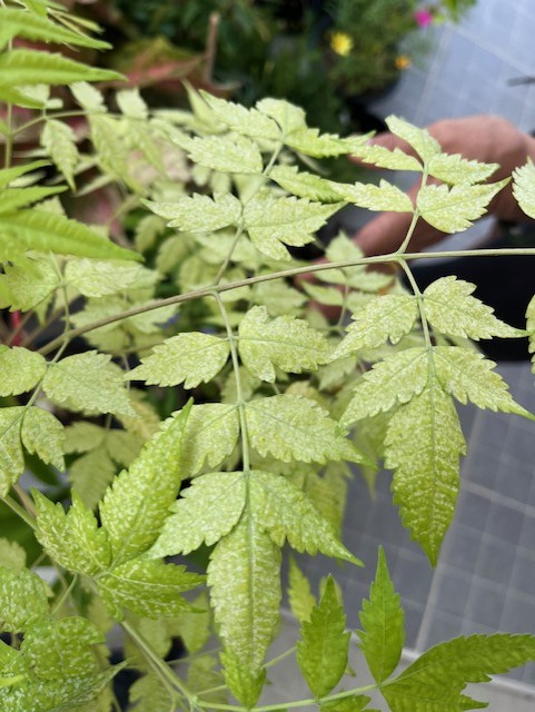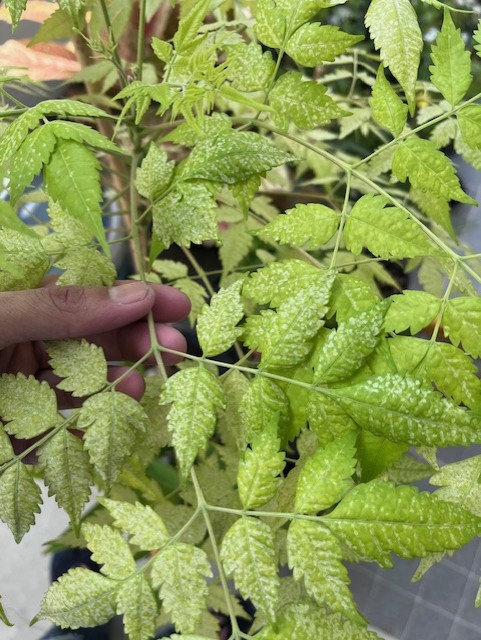 ต้นเลี่ยน (เกตุมณีสีทอง) ตามภาพ ตั้งแต่ซื้อมาได้สัก3เดือน พบว่ามีจุดขาวๆ คิดว่าสีใบซีดลงด้วยคับเทียบกับตอนซื้อมา