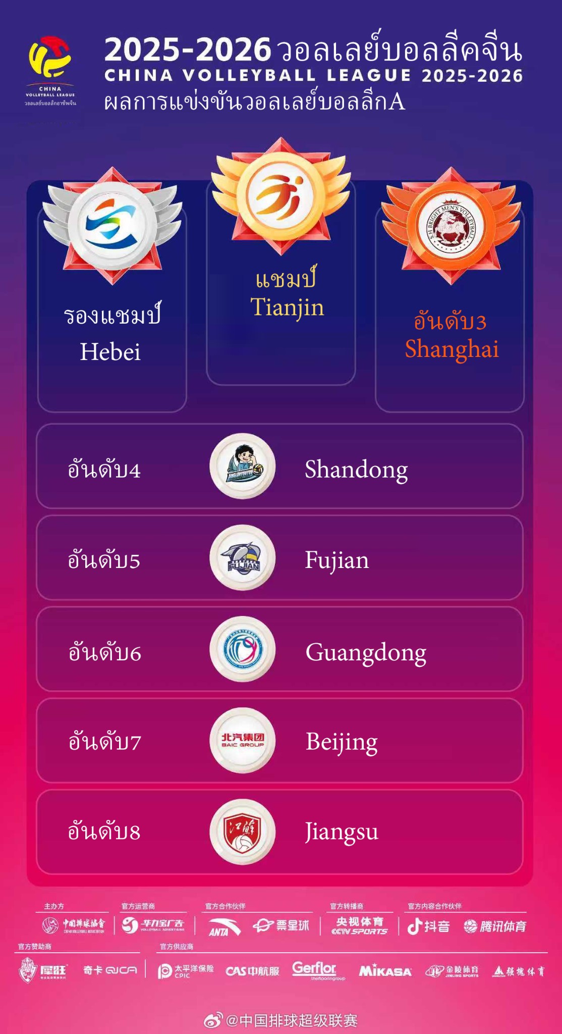 สรุปอันดับและรางวัลส่วนบุคคล วอลเลย์บอลลีกจีน ทีมชาย