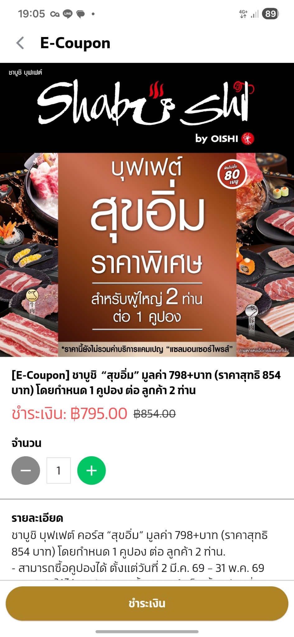 ซื้อคูปองบุฟเฟต์สุขอิ่ม (2 ท่าน) ผ่านแอป BevFood จากราคาเต็ม 854.- เหลือ 795.- (ประหยัดไป 59.-)