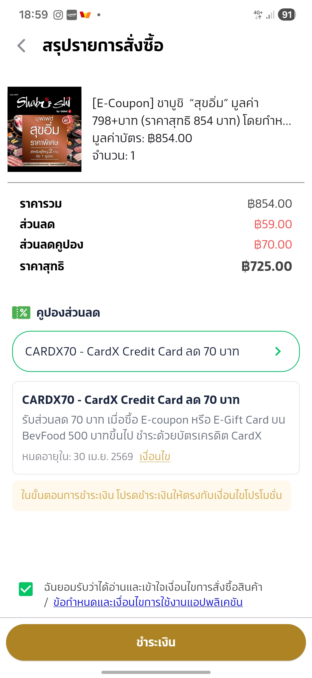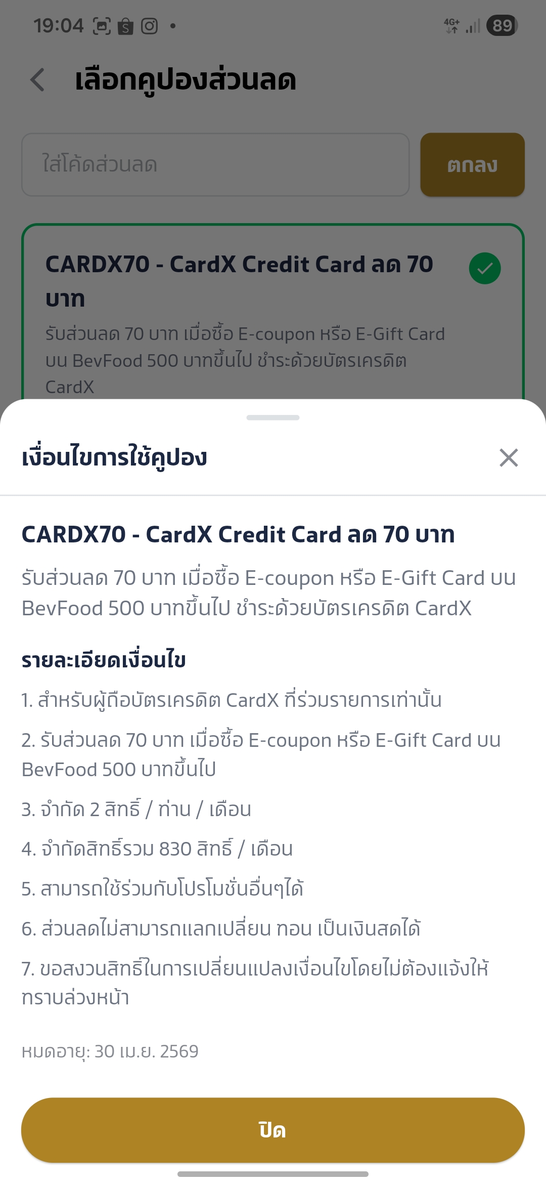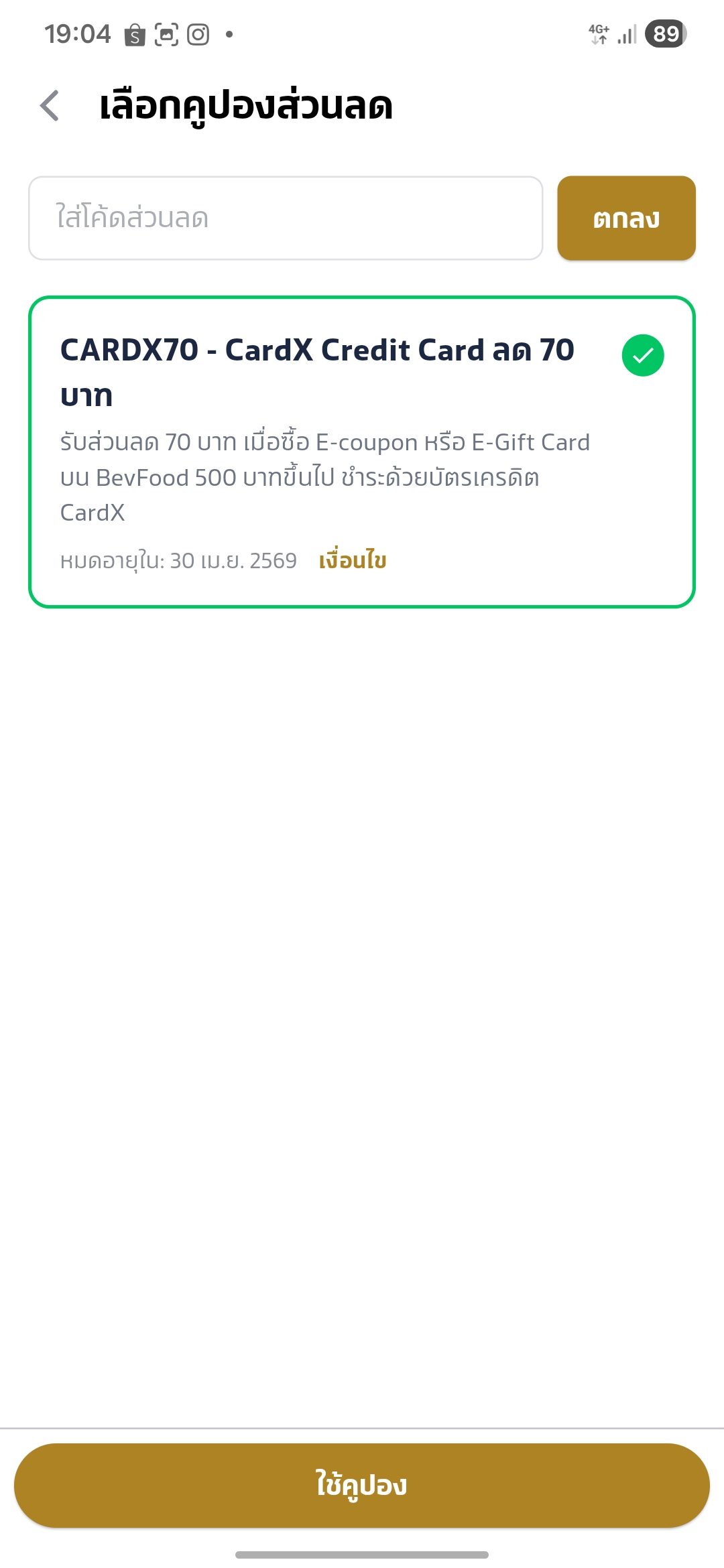 จ่ายผ่านบัตรเครดิต CardX ในแอป BevFood ใส่โค้ด CARDX70 ลดเพิ่มอีก 70.- (เมื่อมียอดครบ 500.-)