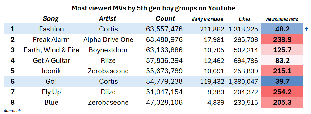 หลังจากปล่อยเพลงออกมาได้ไม่ถึง 6 เดือน เพลง Go! ของ Cortis ก็กลายเป็นเพลงที่มีคนฟังมากที่สุดของบอยแบนด์เจนเนอเรชั่นที่ 5 บน Spotify! Source : Blu