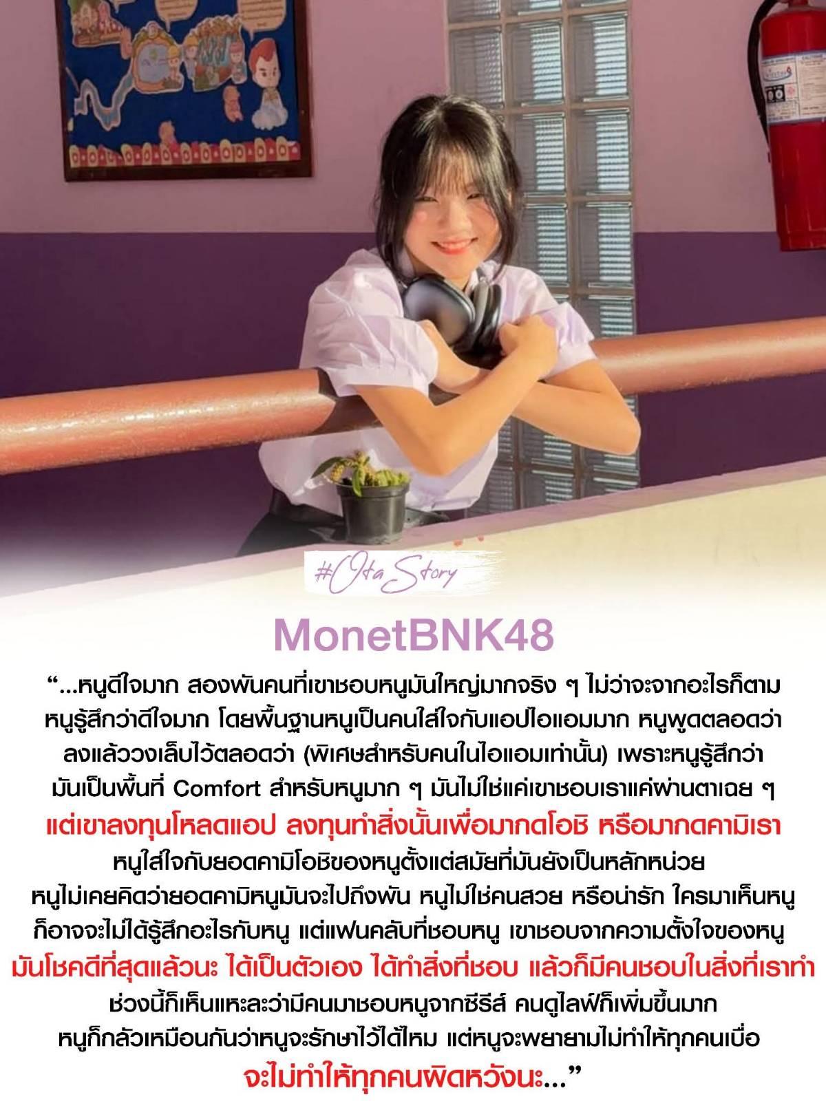 โมเน่ต์ : ตอนแรกหนูคิดว่าต่อสัญญาแล้ว ทุกคนจะเบื่อหนูมั้ย เห็นหน้ากันมา 6 ปีแล้ว มันก็คงไม่เหมือนน้องรุ่นใหม่ๆ ที่เป็นความสดใส หนูคิดว่าหนูยังมีความสุขที่ได้คุยกับแฟนคลับหนู แล้วหนูว่าหนูคิดถูกจริงๆ