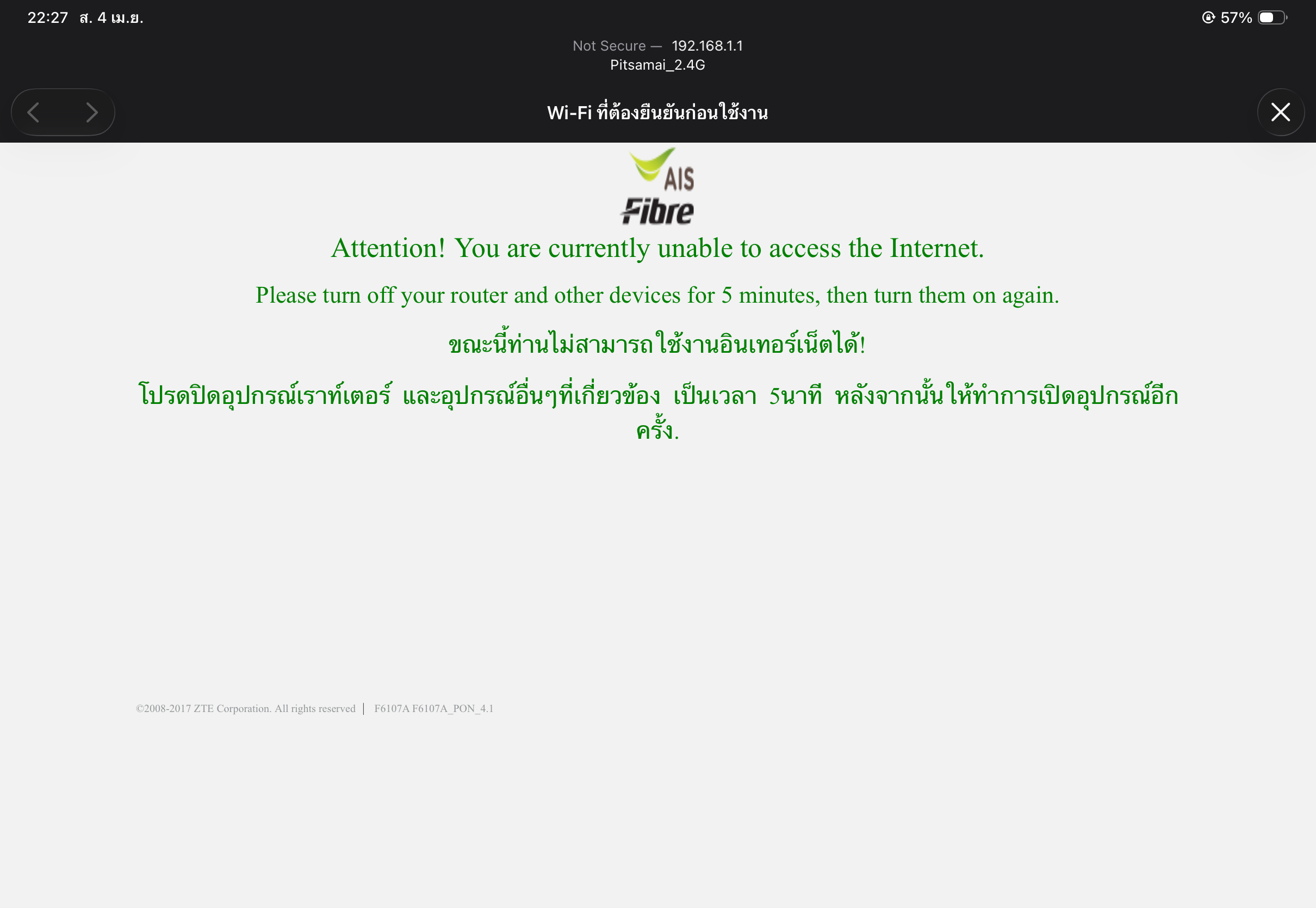 Ais fibre เน็ตบ้านเป็นแบบนี้มาสองวันแล้วค่ะ ลองปิดแล้วเปิดใหม่ก็ยังไม่ได้ ถอดปลั๊กทุกอันออกแล้วก็ยังไม่ได้ ต้องทำยังไงคะ