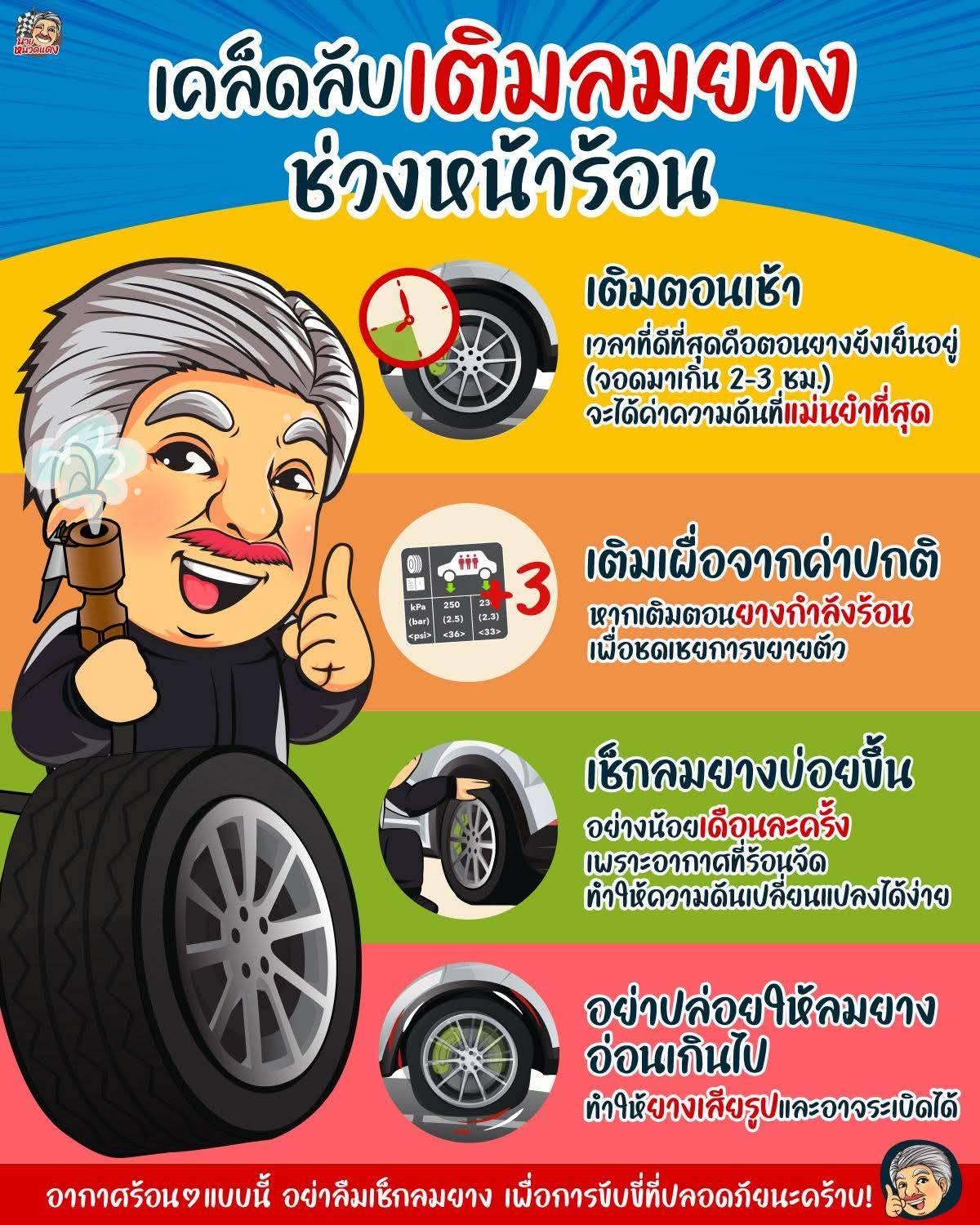 เช็คบ่อยขึ้น: ควรตรวจสอบลมยางอย่างน้อยเดือนละครั้ง เนื่องจากอากาศร้อนจัดทำให้ความดันเปลี่ยนแปลงได้ง่าย