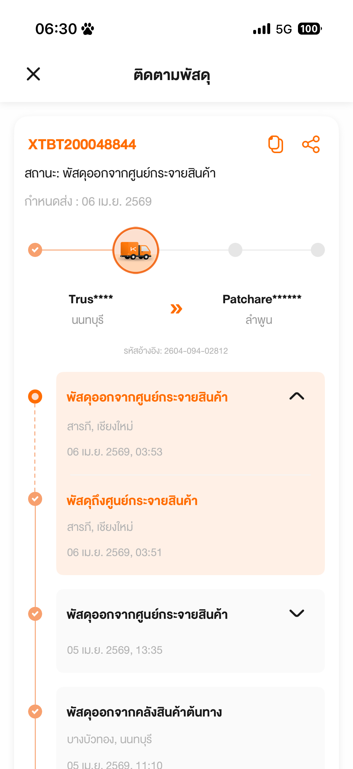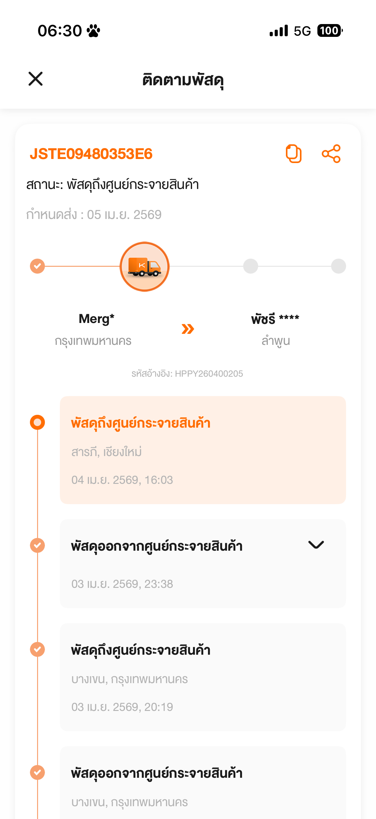 สั่งของไปของจัดส่งให้ตั้งแต่วันที่17 แล้ววันที่18-20ของถึงศูนย์คัดแยกของอยู่ที่นี่เป็นเวลา3วันไม่มีการเคลื่อนไหว วันที่21ขึ้นว่าพัสดุกำลังนำส่งแต่ของไม่มาส่งจนถ