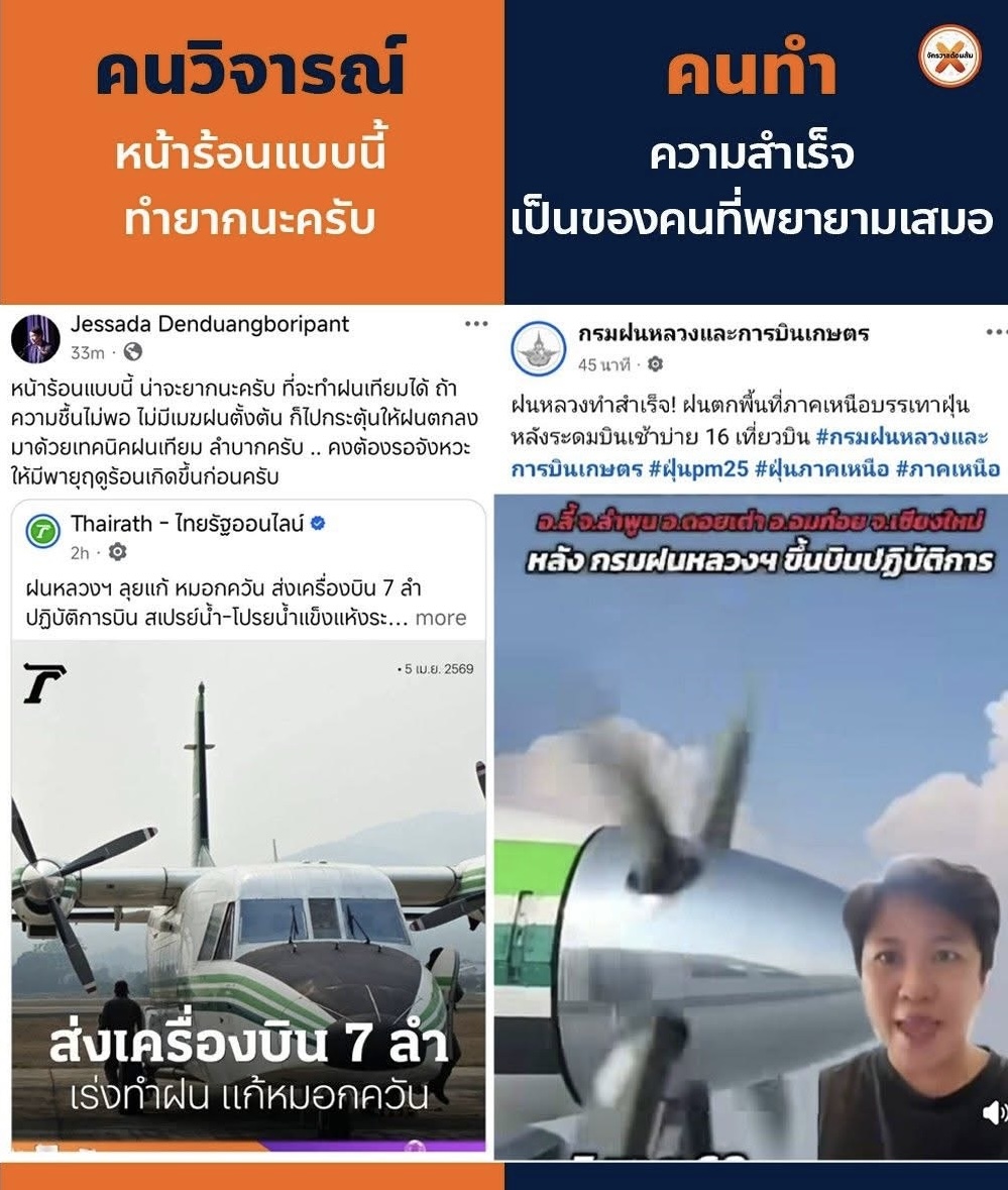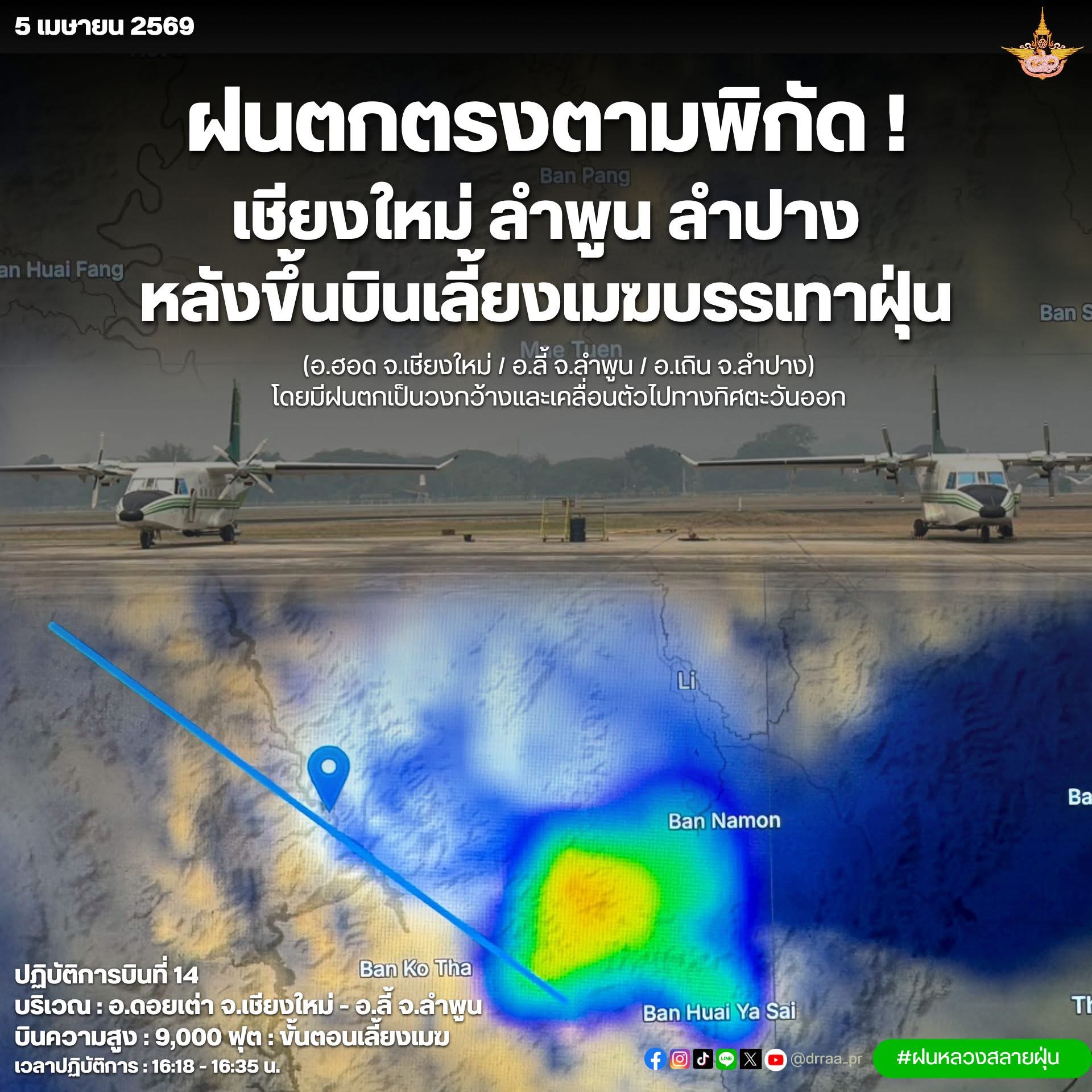 วันที่ 5 เมษายน 2569 เวลา 19.30 น. นายราเชน ศิลปะรายะ อธิบดีกรมฝนหลวงและการบินเกษตร เปิดเผยว่า จากการปฏิบัติการดัดแปรสภาพอากาศในวันนี้ตั้งแต่ช่วงเช้าและช่วงบ่าย เพื่อช่วยบรรเทาปัญหาฝุ่นละอองขนาดเล็ก PM 2.5 จ.เชียงใหม่ และจังหวัดในพื้นที่ภาคเหนือ โดยมีการปฏิบัติการทั้ง 3 เทคนิค คือ การสเปรย์น้ำเย็น การโปรยน้ำแข็งแห้ง เพื่อระบายฝุ่นละอองออกจากพื้นที่ และการก่อเมฆ-เลี้ยงเมฆเพื่อเพิ่มโอกาสให้เกิดฝนตก