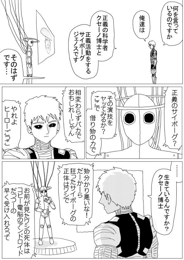 -บอยฟอยบอกรายละเอียดเรื่องตำแหน่งปัจจุบันของคุเซโนะและเจนอสให้ไซตะมะฟังผ่านแอคเซล และบอกให้ไซตะมะรีบไปหาคุเซโนะซะ เพื่อหยุดยั้งพวกหุ่นยนต์อาละวาด