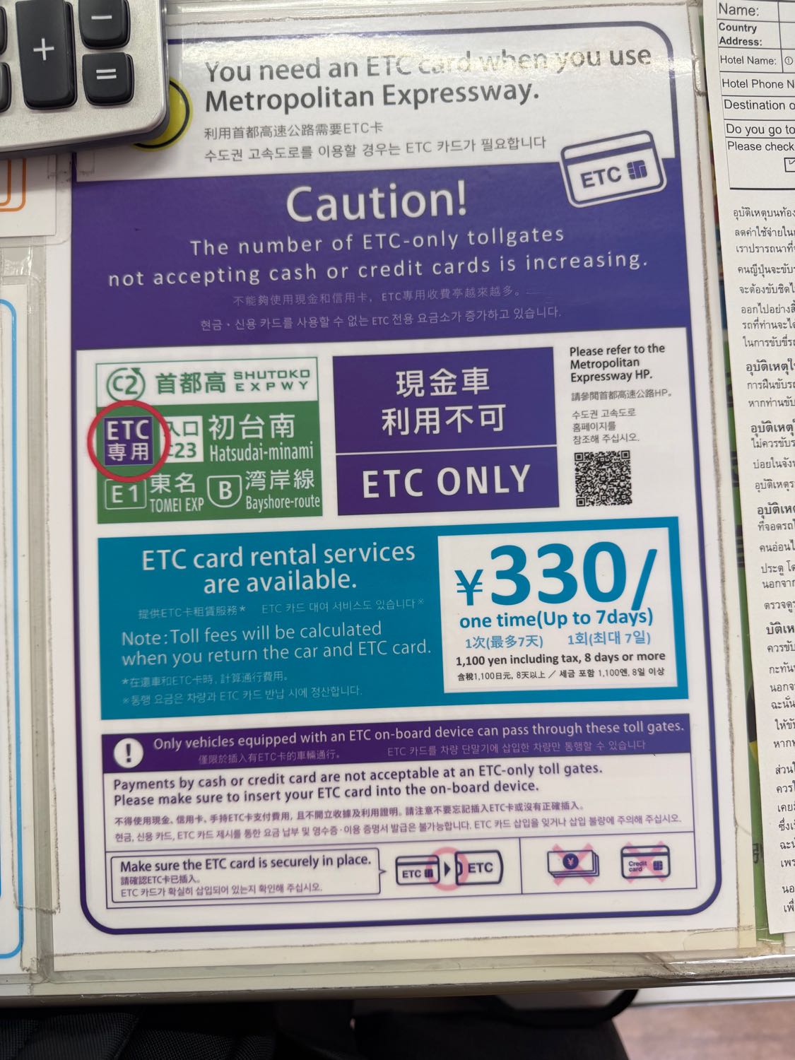 ในการรับรถให้ซื้อเพิ่ม 330 เยน เป็น ETC เหมือนการ์ดขึ้นทางด่วนครับ จำเป็นต้องซื้อครับ เพราะสะดวกไม่ต้องไปเข้าช่องจ่ายเงิน และบางทางด่วนไม่มีช่องจ่ายตังค์ วุ่นไปอีก ดังนั้น ให้เลือกเข้าช่อง มีการ์ดไปเลย ตอนคืนรถทางเจ้าหน้าที่จะรีปริ้นค่าทางด่วนให้เราชำระตอนคืนรถ..