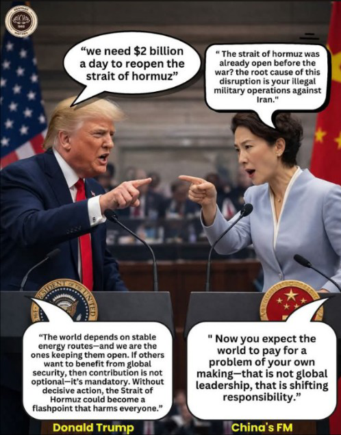 "ช่องแคบฮอร์มุซที่จริงมันเปิดอยู่แล้วก่อนสงครามไม่ใช่หรือ? สาเหตุหลักของการหยุดชะงักนี้คือปฏิบัติการทางทหารที่ผิดกฎหมายของคุณ ต่ออิหร่าน"