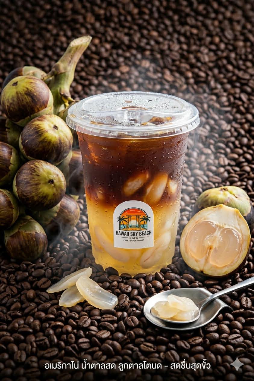 เมนูแนะนำ อเมริกาโน่ น้ำตาลสด.... เพราะน้ำตาลสด หรือลูกตาล ถือเป็นของขึ้นชื่อของเพชรบุรีอยู่แล้ว ร้านเลยเอามาเป็นเมนูแนะนำของร้านด้วยเลย