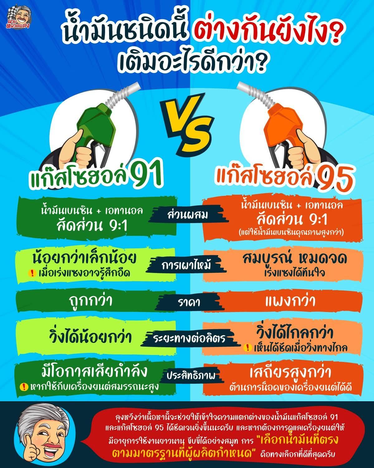 หวังว่าเนื้อหานี้จะช่วยให้คุณเข้าใจความแตกต่างระหว่าง น้ำมันแก๊สโซฮอล์ 91 และ น้ำมันแก๊สโซฮอล์ 95 ได้ชัดเจนยิ่งขึ้น หากคุณต้องการดูแลเครื่องยนต์ให้มีอายุการใช้งานยาวนานและขับขี่ได้อย่างสมูท การเลือกน้ำมันที่ตรงตามมาตรฐานที่ผู้ผลิตกำหนด คือ ทางเลือกที่ดีที่สุดครับ ส่วนการประหยัดน้ำมันเชื้อเพลิงนั้นอยู่ที่วิธีการขับของแต่ละท่าน ไม่ใช้คันเร่งแรง ขับขี่ปลอดภัย ตรวจเช็ครถให้สมบูรณ์พร้อมใช้งานเสมอครับ