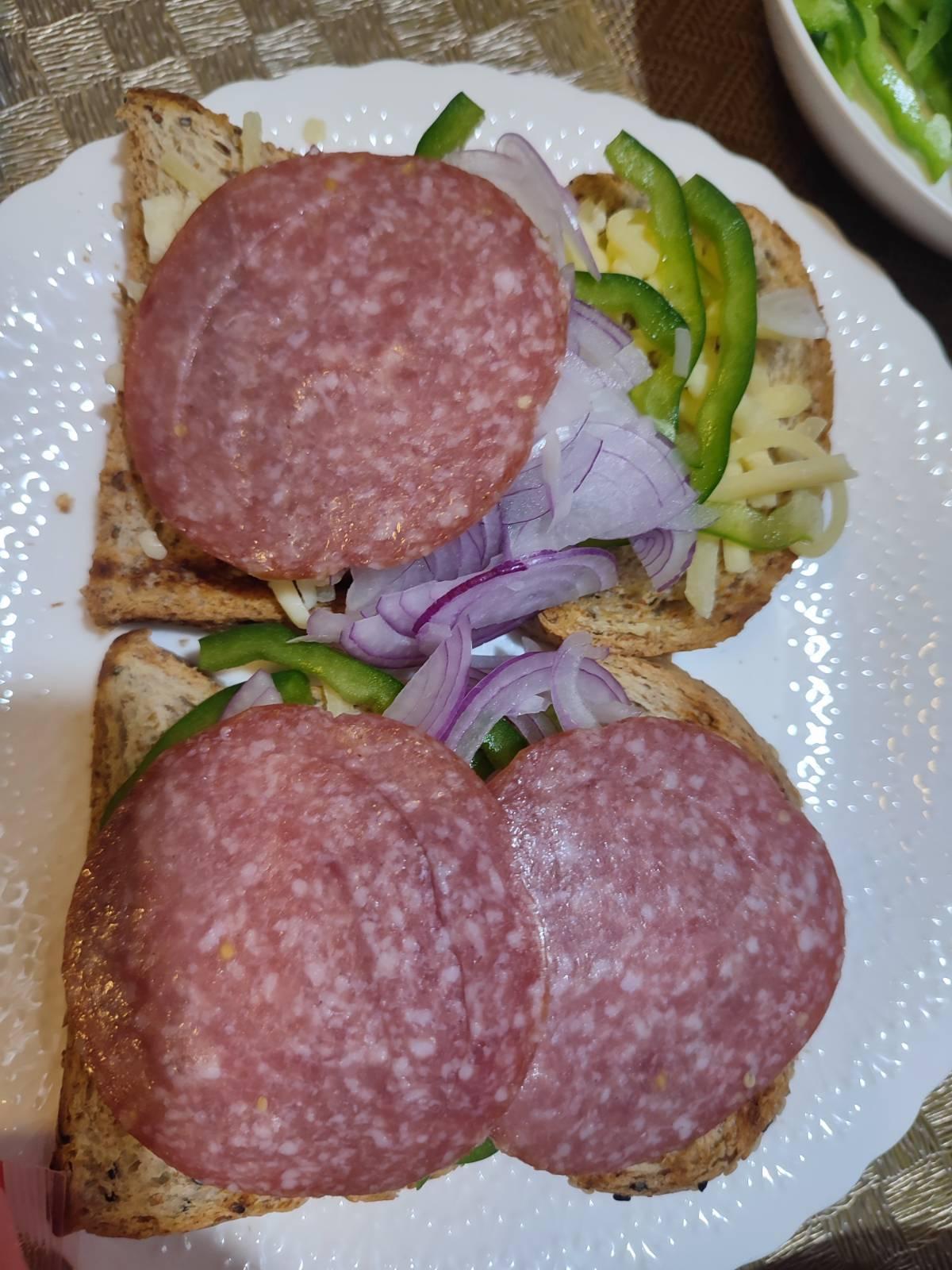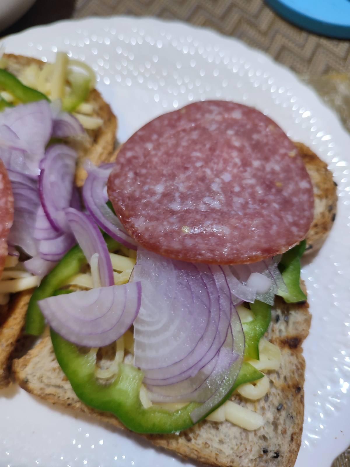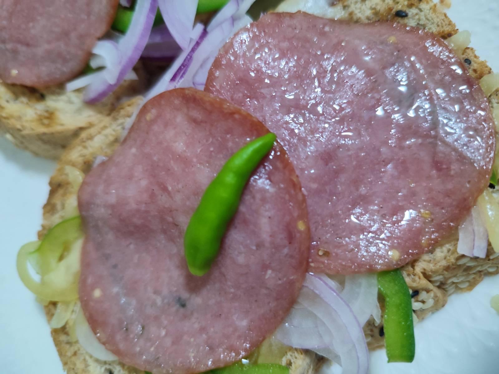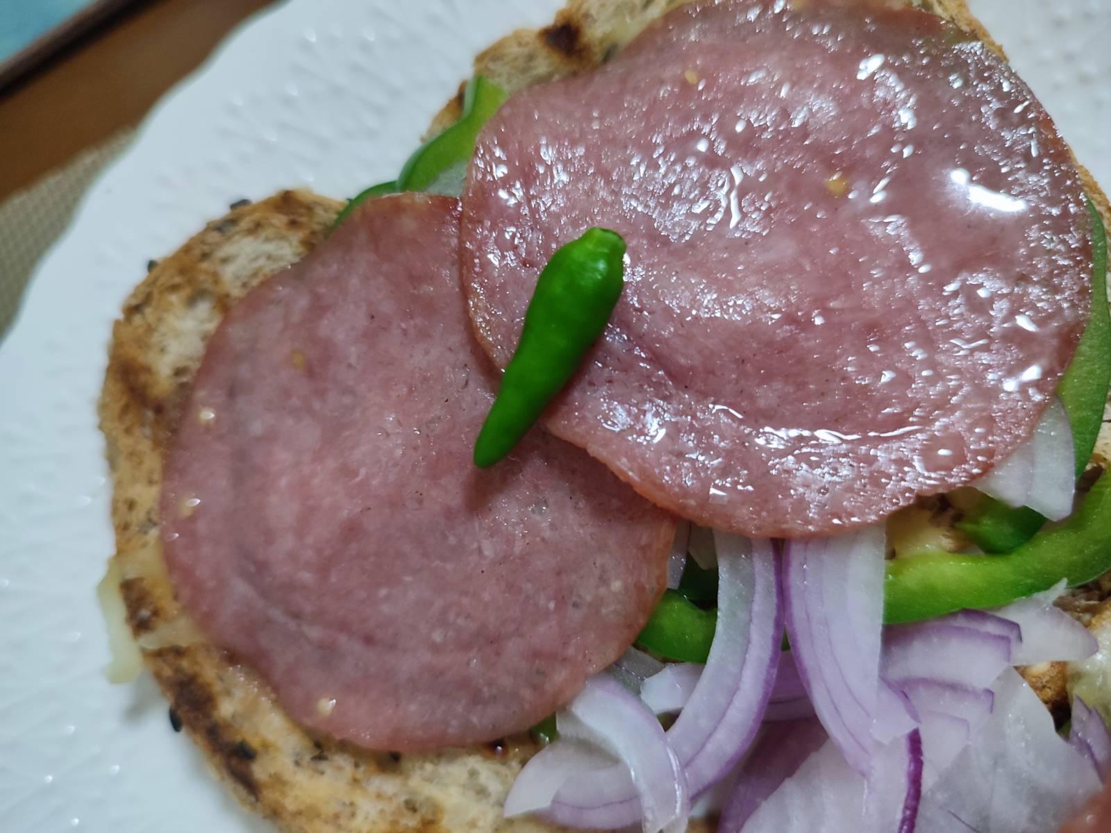 เอาชีส หอมซอย ซาลามี่เรียง เข้าเตาไมโครเวฟ ถ้ามีเตาอบก็เอาเข้าเตาอบนะ แป๊บเดียวพอชีสละลายครับ