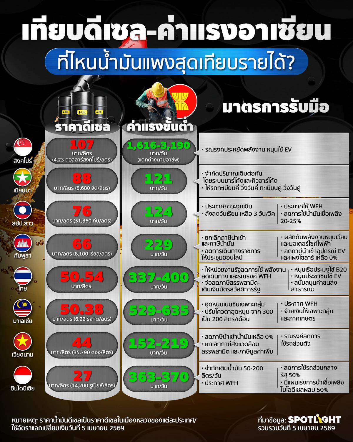 แรงกดดันจากราคาพลังงานที่เร่งตัวขึ้นกลายเป็นโจทย์เชิงโครงสร้างของเศรษฐกิจอาเซียน โดยเฉพาะเมื่อพิจารณาควบคู่กับระดับรายได้ของประชาชนในแต่ละประเทศ ข้อมูลเปรียบเทียบล่าสุด ณ วันที่ 5 เมษายน 2569 ซึ่งอิงอัตราแลกเปลี่ยนในวันเดียวกัน และใช้ราคาน้ำมันดีเซลในเมืองหลวงของแต่ละประเทศ สะท้อน “ภาระพลังงาน” ที่แตกต่างกันในระดับภูมิภาค