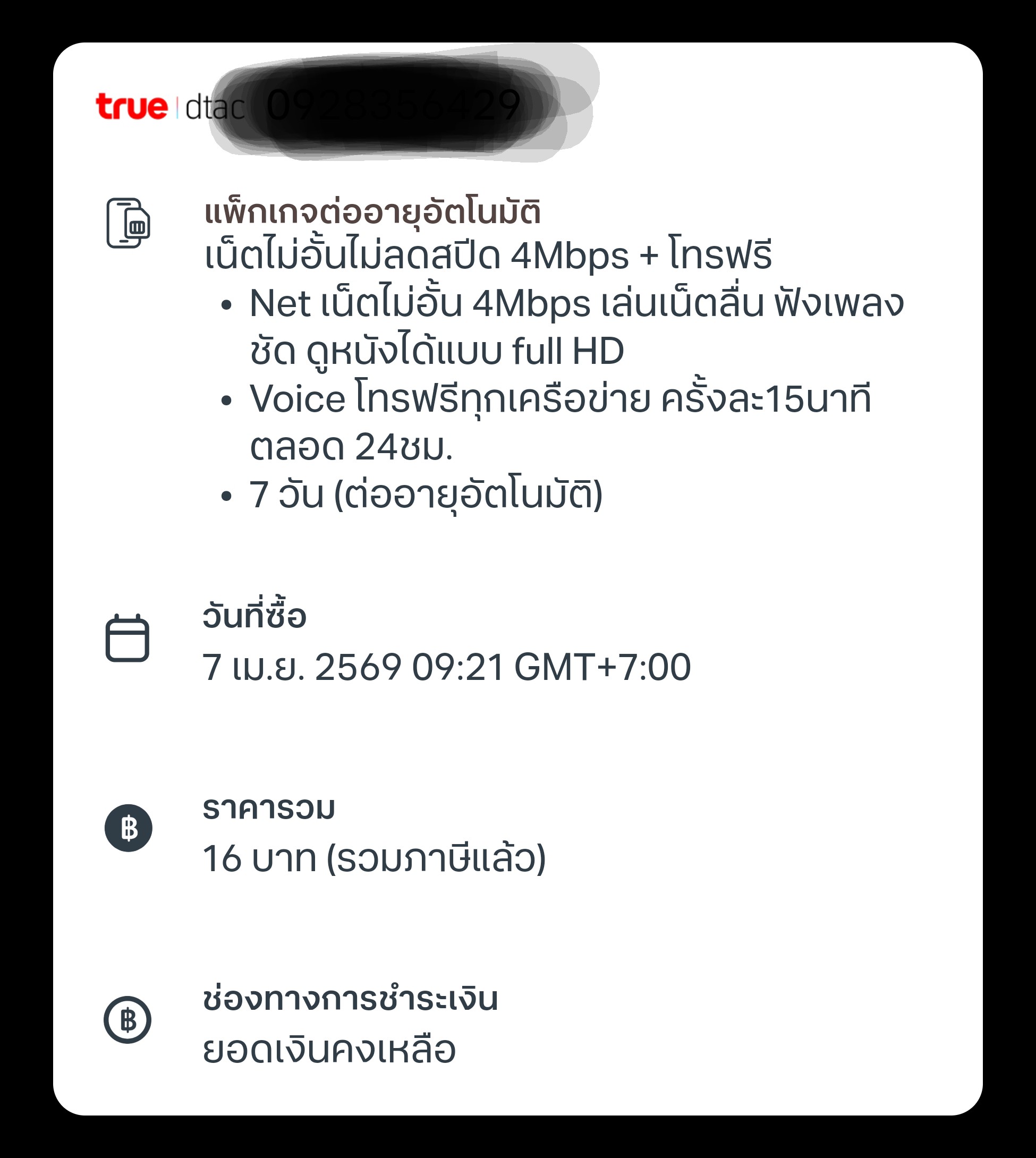ผมผู้ใช้เครือข่าย True จะทำการเติมแพ็คเกจเสริมที่ใช้อยู่ประจำ *ทุกครั้งที่เน็ตหมด ระบบจะต่อให้อัตโนมัติ แต่ครั้งนี้ผมไม่ได้เติมเงินไว้ในซิม ระบบเลยไม่ได้ทำการต่อแพ็คเกจเสริมให้ โดยอัตโนมัติ ดั้งนั้นผม