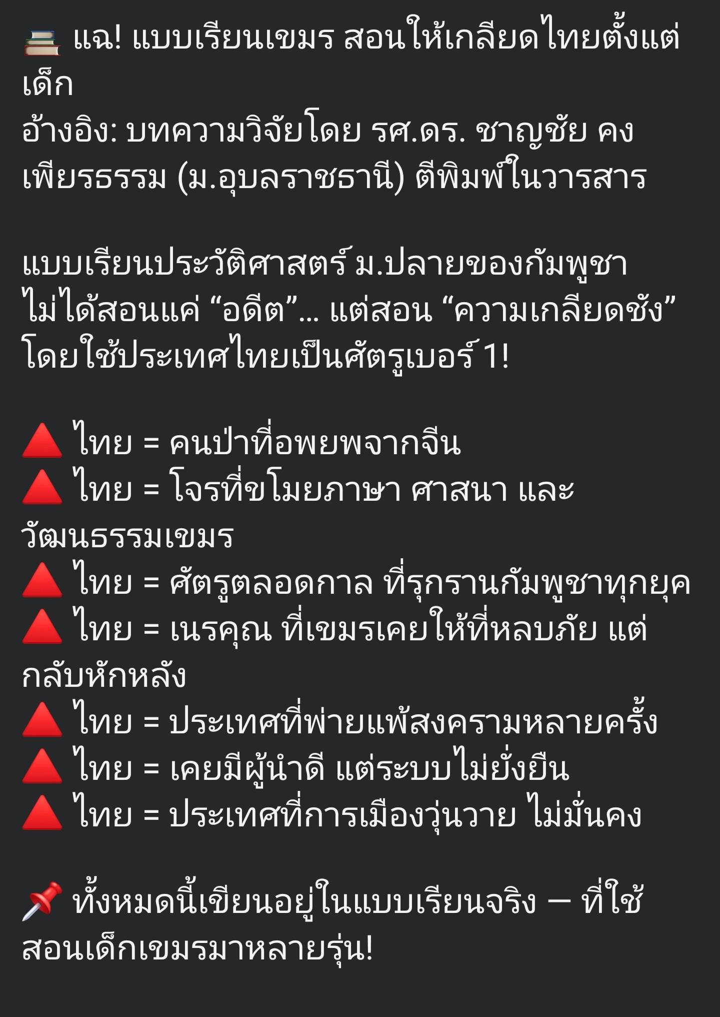 เห็นจากเพจ CSI LA อ่านแล้วก็ .... อืม ไม่ได้สอนแค่ “อดีต”… แต่สอน “ความเกลียดชัง” โดยใช้ประเทศไทยเป็นศัตรู 1. ไทย เป็นคนป่าที่อพยพลงมาจากทางตอนใต้จากจีน2. ไทย เป็นโจรที่