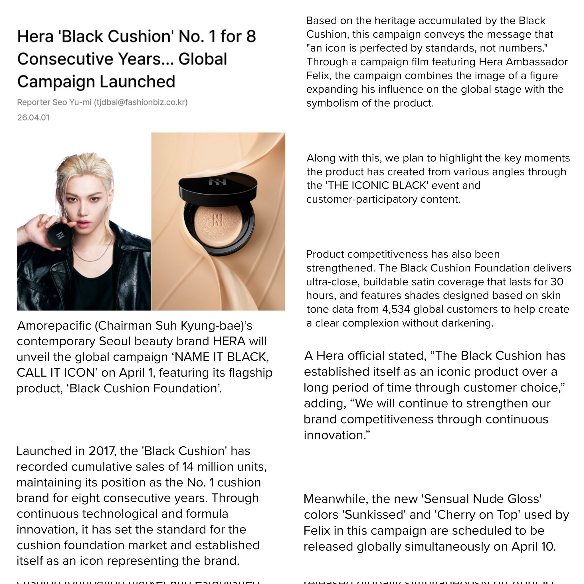 คุชชั่นสีดำที่มียอดขายสะสมทะลุ 14 ล้านชิ้นนับตั้งแต่เปิดตัวในปี 2017 และครองตำแหน่งอันดับ 1 ในหมวดคุชชั่นในประเทศติดต่อกันถึง 8 ปี ได้เสริมสร้างสัญลักษณ์ของแบรนด์ในตลาดต่างประเทศให้แข็งแกร่งยิ่งขึ้นด้วยการเข้าร่วมแคมเปญของเฟลิกซ์ สมาชิกวง Stray Kids ในฐานะทูตระดับโลก