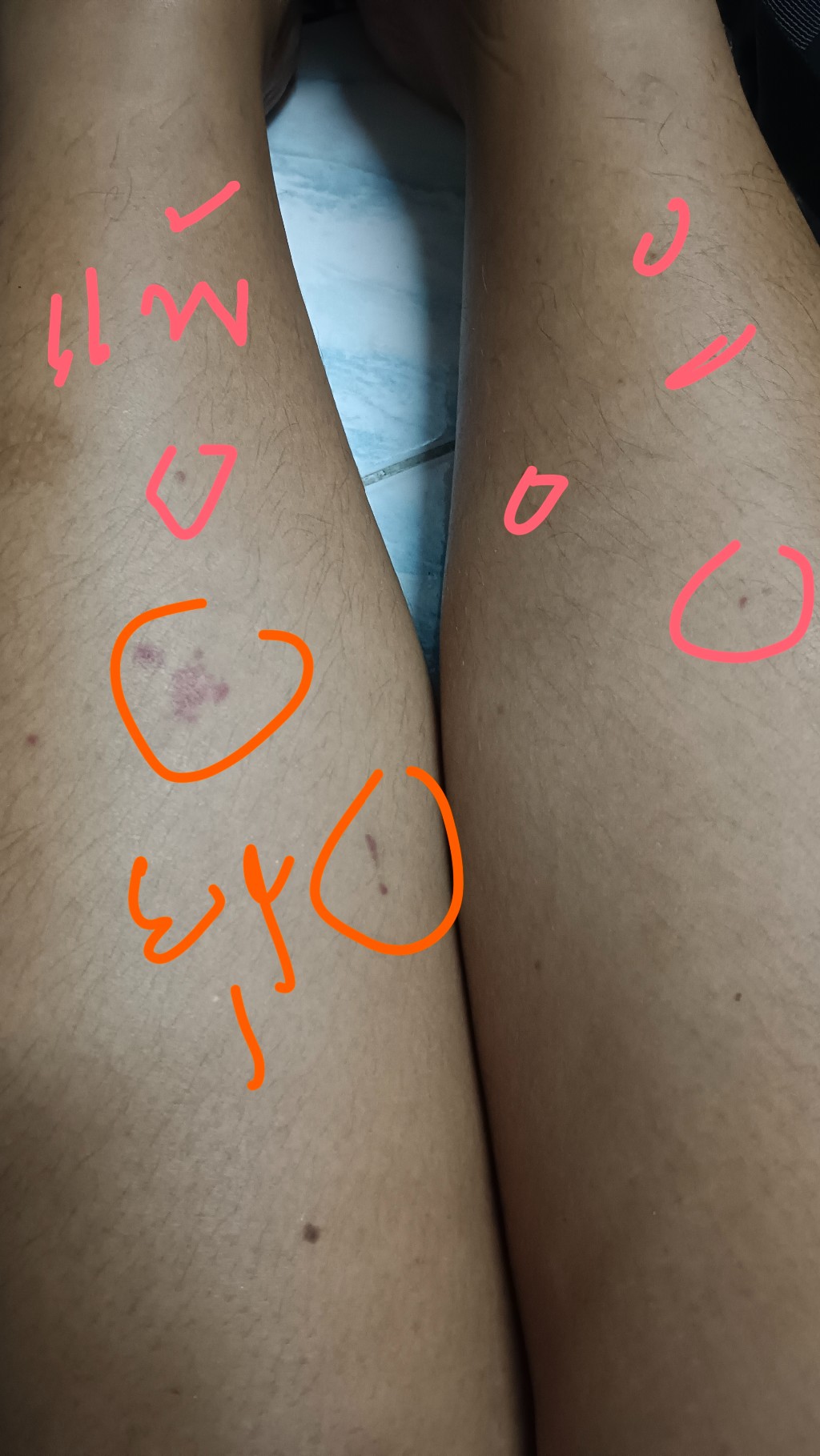ตอนแรกมีอาการคันมากพร้อมตุ่มยุงปกติเต็มขา พอผ่านไปได้ 2-3 วันเริ่มขึ้นเป็นจุดแดงนูน ส่วนตัวเคยแพ้น้ำลายยุงจนนอนรพ.ตอนเด็กๆค่ะ มันนานมากแล้วเราไม่เคยคิดว่าเราจะมีปัญหากับยุงขนาดนี้ เพราะตอนไปเรียนรด.ก็ไม่ได้อะไรเป็นพิเศษ+ทายากันยุง ทีนี้ยังมีจุดเล็กๆปรากฎขึ้นมาข้างๆ ซึ่งจุดนี้เราเคยเป็นเมื่อ6-7 เดือนก่อนตอนเข้ากรุงเทพ กลับมาไอตลอดเหมือนจะเป็นภูมิแพ้ค่ะ ตอนนั้นก็กินยาแก้แพ้ตุ่มจุดเล็กก็หายไป แต่รอบนี้เราแยกไม่ออกเลยค่ะ เหมือนจะมีจุดเล็กๆคล้ายๆกันขึ้นมาอีก พอเริ่มแดงมากๆเรามีอาการน้ำมูกไหลตลอดเวลา เจ็บคอ ไอนิดหน่อย ป่วยกระเสาะกระแสะมาจนถึงตอนนี้ที่เริ่มมีอาการรุนแรงแบบกินข้าวยาก เราก็ไปหาหมอที่สมิติเวช ซึ่งหมอจ่ายยาตามอาการพวกยาฆ่าเชื้อ ลดน้ำมูก แก้แพ้ และยาทาจากการแพ้กลุ่มสเตียรอยด์ ซึ่งหมอก็ไม่ได้ฟันธงว่าเกิดจากอะไร (พลาดที่เราไม่ได้หาหมอโรคผิวหนัง แต่จังหวะนั้นไข้กินก่อนเลยเลือกไข้) ตอนนี้เริ่มมาสังเกตว่าเหงื่อออกเริ่มเจ็บ ตุ่มใหญ่พองๆเหมือนมีน้ำอยู่ข้างใน ปกติไม่เคยลามแบบนี้เลยค่ะ ตอนนี้แยกไม่ออกแล้วว่ายุง หรือผิวหนังเราแพ้
