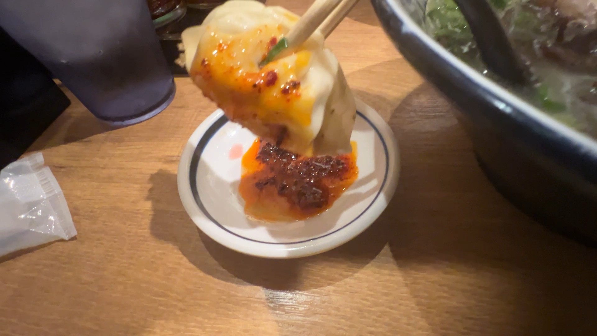เกี๊ยวซ่าคำเดียว (Hakata One-bite Gyoza): เกี๊ยวซ่าชิ้นจิ๋วแต่แจ๋ว! แป้งบางกรอบ ด้านในฉ่ำวาวด้วยน้ำซุปเนื้อ ยิ่งจิ้มกับน้ำมันพริกสูตรลับของร้าน... ชิ้นเดียวไม่เคยพอจริงๆ!
