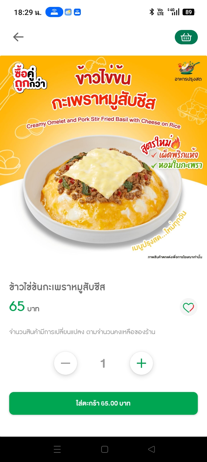 ภาพของที่ได้ ปกติสั่งเป็นเดลิเวอรี่กินเป็นปกติอยู่แล้วก็จะมีบางครั้งที่ของหมด พนักงานก็จะโทรมาแจ้งเราก็ยกเลิกออเดอร์ไป แต่ครั้งนี้คือ...ไม่มีการโทรมาแจ้งใดๆ เราตอนของมาส่งก็ไม่ได้ดู รับมาแล้วก็ยังไม่ได้กินก็เลยยังไม่รู้เรื่อง ว่าจะเปิดกินอีกทีตอนหิวแต่กว่าจะเปิดกินก็ผ่านมาหลายชม.แล้ว เปิดมาช็อคเลย ผัดกระเพราหมูสับที่ไม่เห็นพริกไม่เห็นใบกะเพรา เห็นแต่หมูสับซีดๆ ไม่มีชีสทั้งที่ปกติก็มี คือถ้าของหมดก็แค่โทรมาแจ้ง เราจะได้ยกเลิกออเดอร์ แต่อันนี้คือดูถูกลูกค้าเกิน หิวก็หิว