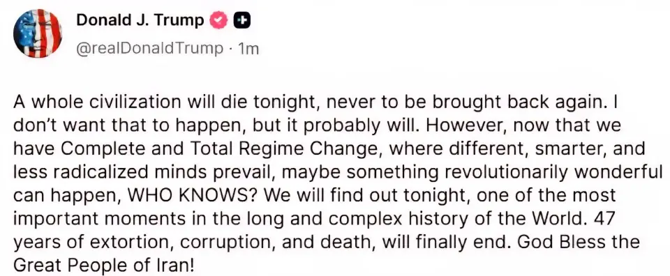 ทรัมป์ยังได้โพสต์ข้อความเตือนถึง "การอวสานของอารยธรรมและระบอบอิหร่าน" ในคืนนี้หากข้อเรียกร้องไม่ได้รับการตอบสนอง