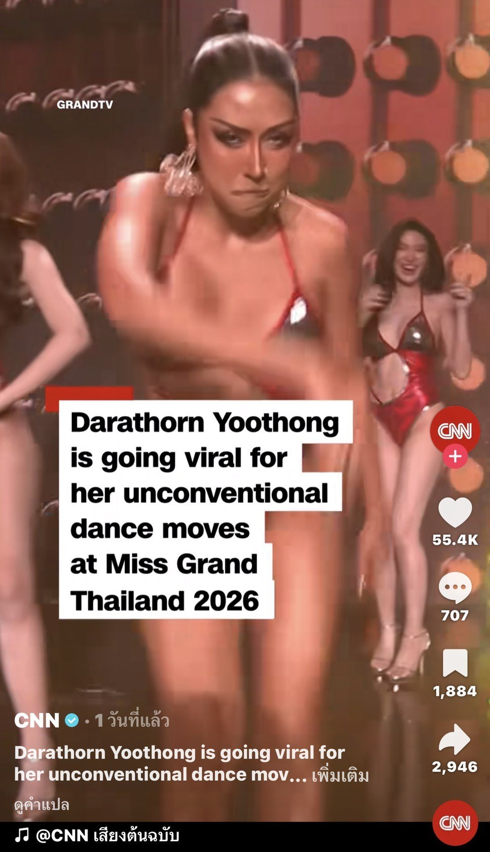 Darathorn Yoothong is going viral for her unconventional dance moves at Miss Grand Thailand 2026 which were viewed over 30 million times on social media. https://web.facebook.com/share/r/1B9frXLAER/