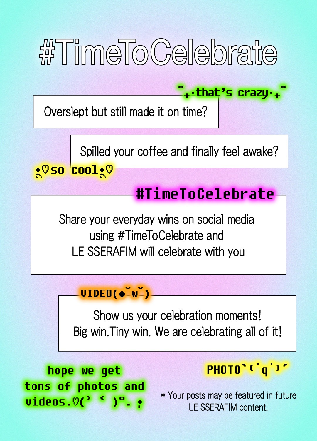 ทางเพจต่างๆของ LE SSERAFIM ได้เชิญชวนให้พิออน่าส่งรูปหรือเรื่องราวที่น่าเฉลิมฉลองกับฟิมมี่ผ่านทาง hashtag #TimeToCelebrate ซึ่งผู้โชคดีจะได้รับเลือกให้โชว์ในคอนเท้นต์ของ LE SSERAFIM ด้วย