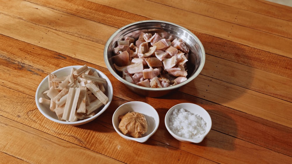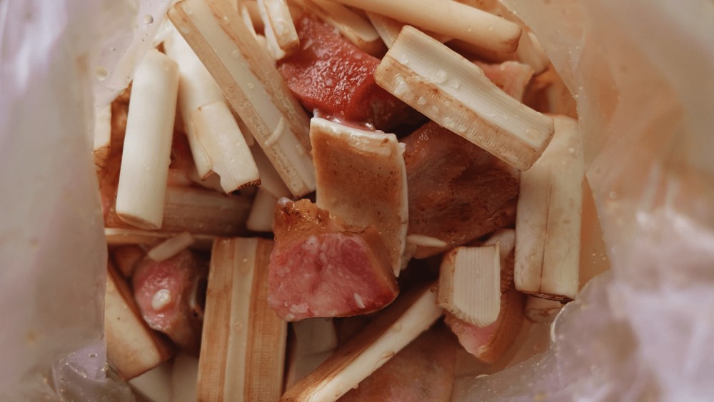 สูตรของพี่เด่นมีความพิเศษ คือพี่เด่นไม่ได้ใส่แค่เนื้อหมู แต่ยังใส่ หยวกกล้วย ที่ตัดสดๆ จากหลังบ้าน ลงไปหมักพร้อมกับ เกลือ และ น้ำตาล