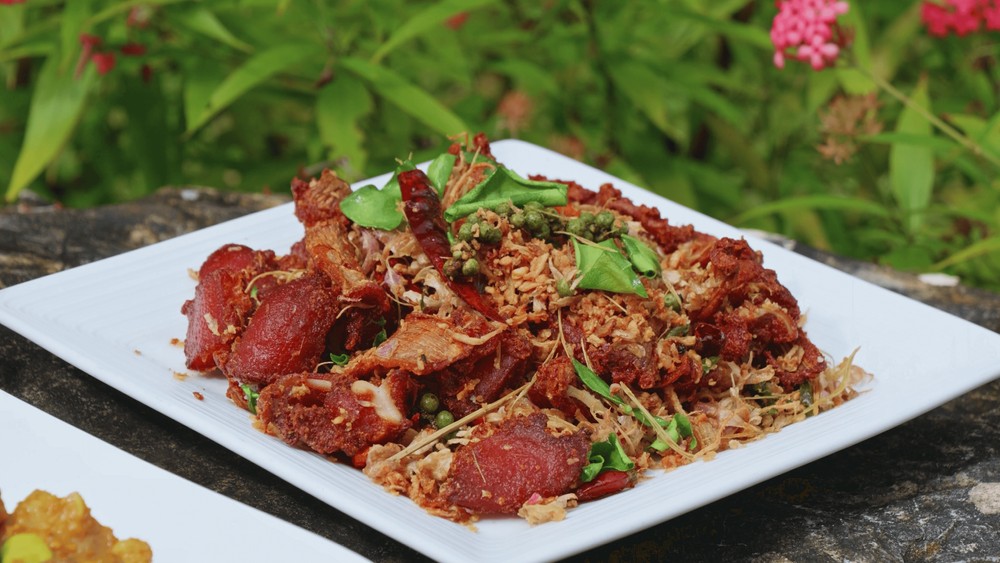 1. หนางทอดสมุนไพร: เอกอุด้านรสสัมผัส เพราะเราได้เคี้ยวทั้งหนังหมูที่กรอบเด้ง และหยวกกล้วยหมักที่ให้สัมผัสหนึบหนับ ตัดกับสมุนไพรทอดกรอบ
