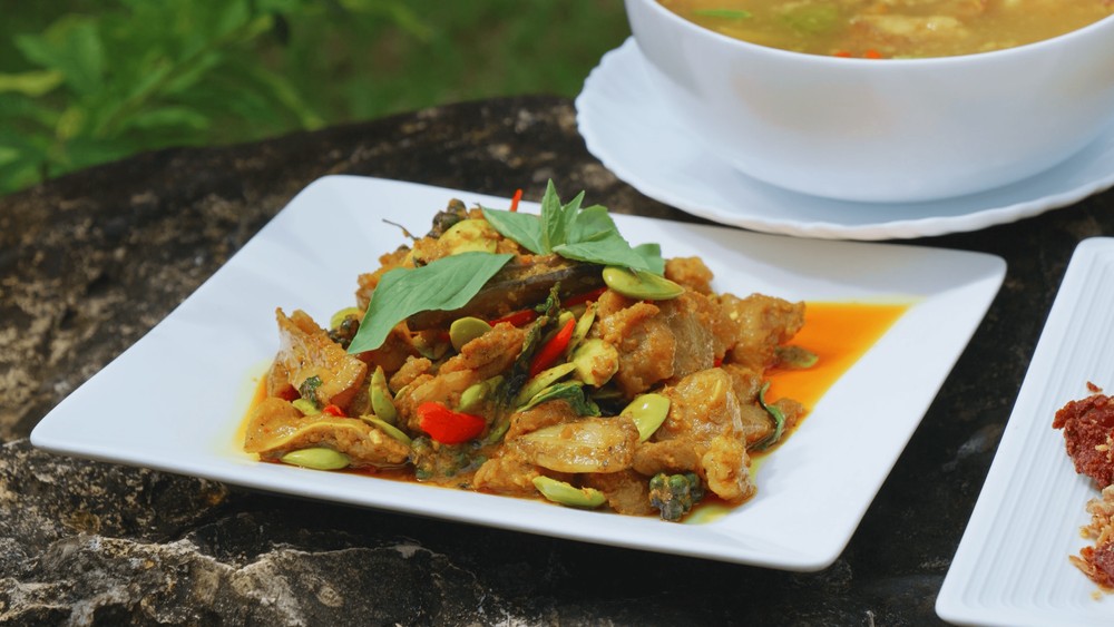 2. ผัดเผ็ดหนางสะตอ: พี่เด่นเอาหนางไปล้างน้ำก่อนเพื่อลดความเปรี้ยว แล้วนำมาผัดกับเครื่องแกงใต้ที่เผ็ดร้อน ใส่สะตอลงไป…ค้นพบว่ากลิ่นหมักของหนาง กับกลิ่นฉุนของสะตอ พอมาเจอกัน มันกลับกลมกล่อมและนัวอย่างเหลือเชื่อ