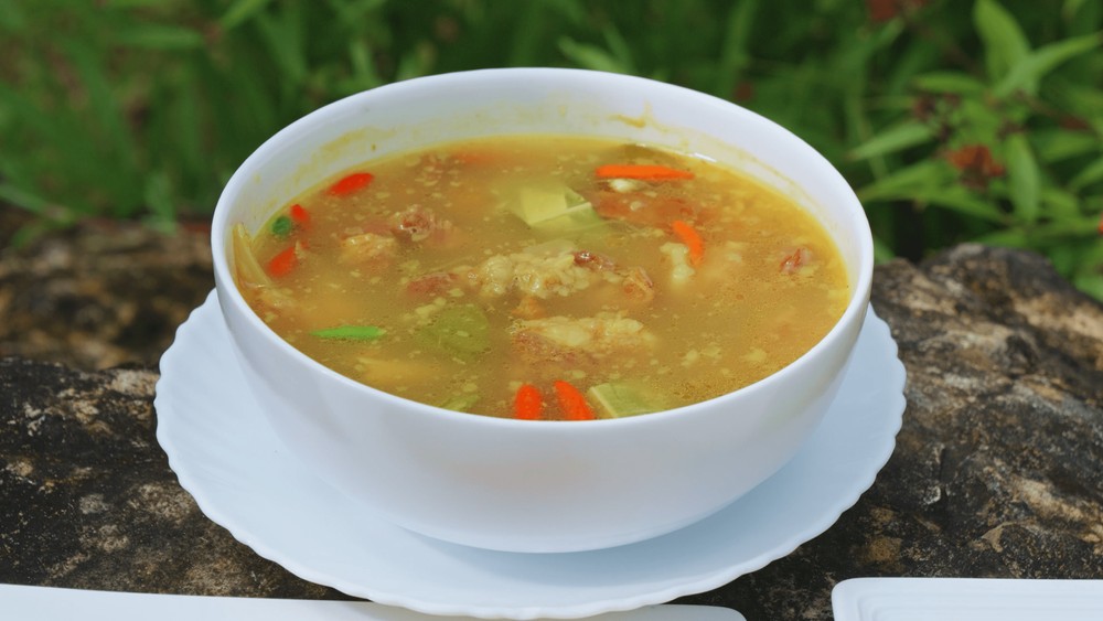 3. ต้มเปรต: หน้าตาคล้ายต้มยำน้ำใส ใส่เครื่องสมุนไพรและ "ขมิ้น" ตามสไตล์ปักษ์ใต้ สังเกตได้ว่า พี่เด่นไม่บีบมะนาวเลยแม้แต่หยดเดียว แต่รสเปรี้ยวที่ได้ มันมาจากกรดแลกติกในเนื้อหนางล้วน ๆ เป็นความเปรี้ยวที่ "นวล" กลมกล่อม ไม่แหลมแสบคอ ซดคล่อง