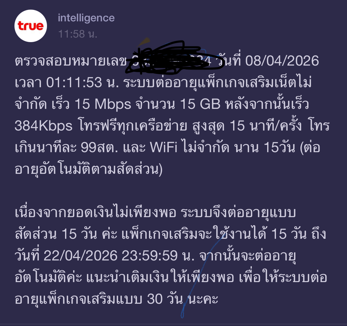 อันนี้คือแพ็คที่เราต้องการสมัคร ดูเวลาที่แพ็คจะตัดคือ08/04/26 เวลา00.00 เติมไปตอน7/4/26 เวลา00.34 จนทบอกเงินไม่พอ ทั้งที่ยอดมันถึง ตรวจสอบยังไงคะ