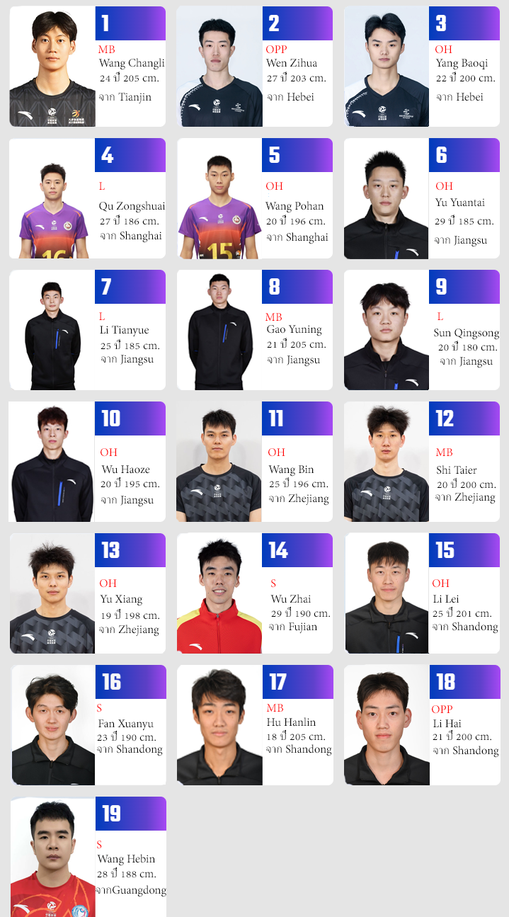 ซานตง: LI Lei (25) OH 201 cm มารอบ4ทีนางสติหลุดมาก โดนคอกเลย , Fan Xuanyu (23) S 190 cm เกี่ยมปั้น ปั้นคนนี้ต่อเลยลุง ,Hu Hanlin (18) MB 205 cm ได้ Best MBล่าสุด บล็อคดีมาก , Li Hai (21) OPP 200 cm ลงแทนพี่จิ่งยี่ได้ดีเลย ตีได้เรื่อยๆ
