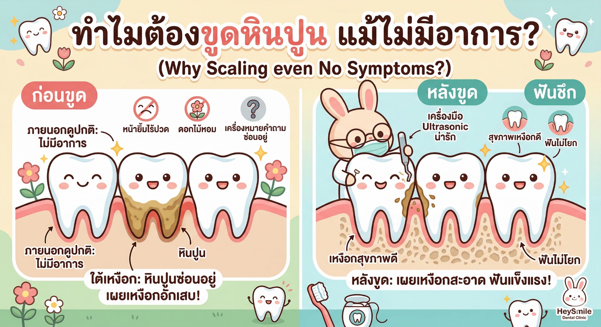 ทำไมต้องขูดหินปูน ทั้งที่ฟันก็ดูปกติดี ไม่มีอาการปวดหรือกลิ่นปากเลย? คำตอบคือ หินปูนเปรียบเหมือน "ภัยเงียบ" ที่สะสมตัวอยู่ใต้ขอบเหงือกโดยที่เราไม่รู้ตัวครับ กระทู้นี้หมอจะมาสรุปให้ฟังง่ายๆ ว่าทำไมการขูดหินปูนถึงเป็นเรื่องที่เราละเลยไม่ได้เลย!