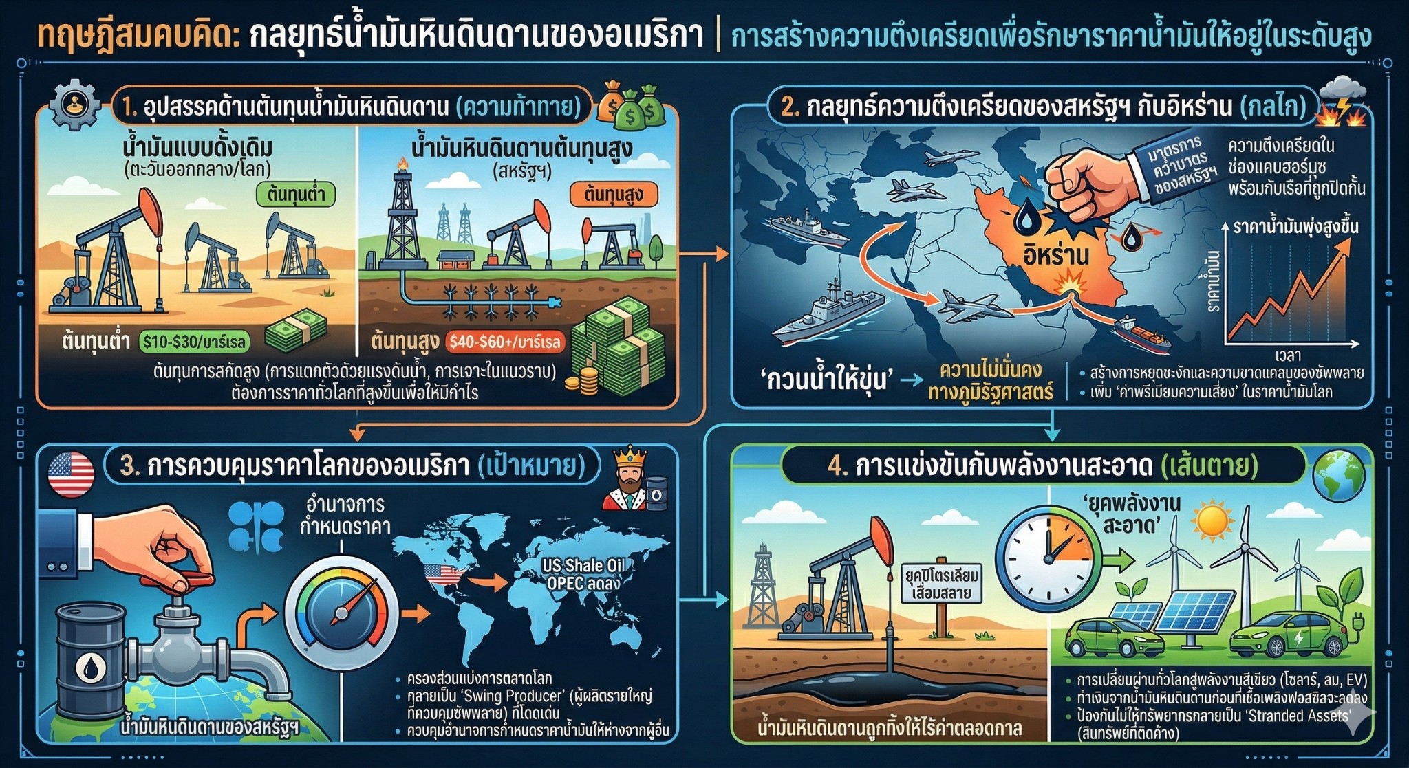 ความสำเร็จของ "Shale Revolution" ในปี2008 ทำให้อเมริกามีปริมาณสำรองน้ำมันมหาศาล แต่จุดตายคือ "ต้นทุน" การขุดเจาะหินดินดาน (Fracking) นั้นสูงกว่าการขุดน้ำมันในทะเลทรายของกลุ่มประเทศอาหรับหลายเท่าตัว หากราคาน้ำมันโลกตกต่ำ Shale Oil จะกลายเป็นสมบัติที่ไร้ค่าทันที ทฤษฎีนี้จึงเชื่อว่าอเมริกาต้องรักษา "พรีเมียมของความเสี่ยง" (Risk Premium) ด้วยการสร้างสถานการณ์ตึงเครียดกับอิหร่าน เพื่อประคองให้ราคาน้ำมันโลกทรงตัวอยู่ในระดับที่การผลิต Shale Oil ยังคงคุ้มทุนและทำกำไรได้มหาศาล