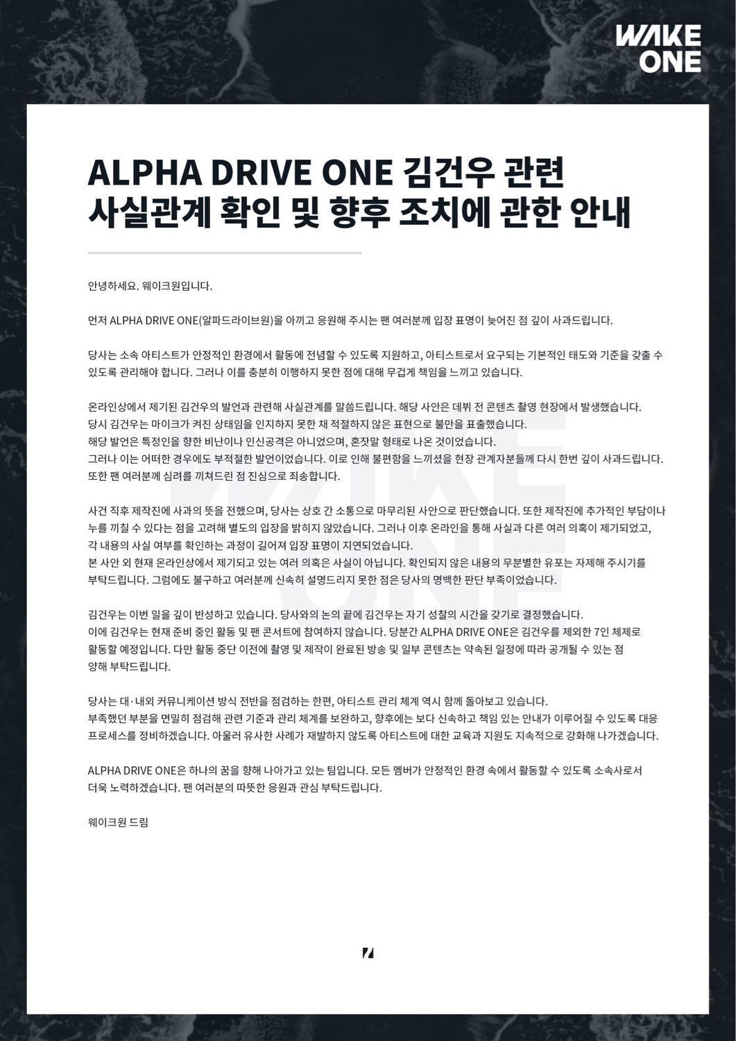 WAKEONE ประกาศว่า คิม กอนอู จะพักกิจกรรมเพื่อไตร่ตรองถึงสถานการณ์หลังจากเกิดข้อโต้แย้งเกี่ยวกับคำพูดก่อนเดบิวต์