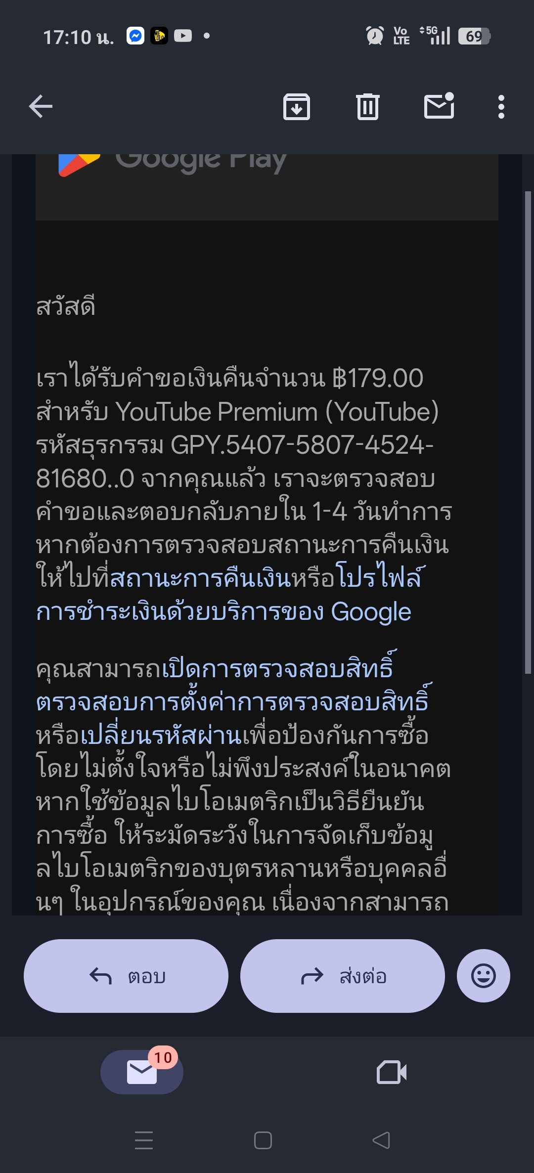 ต้องทำยังไงคะ มันหักเงินไปแล้วแต่มันแจ้งอีเมลมาว่า ปฏิเสธการชำระเงินสำหรับการสมัครใช้บริการ YouTube ค่ะ เงินยิ่งหายากๆอยู่แล้วมาเจออะไรแบบนี้อีก