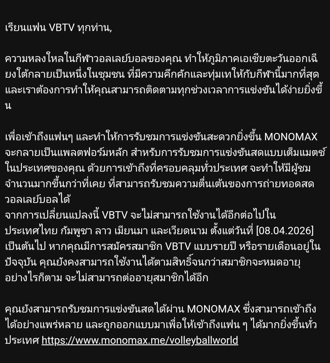 ประกาศจาก VBTV จะไม่สามารถใช้งานได้ในประเทศไทยได้อีกต่อไป เนื่องจาก MONOMAX ได้ลิขสิทธิ์