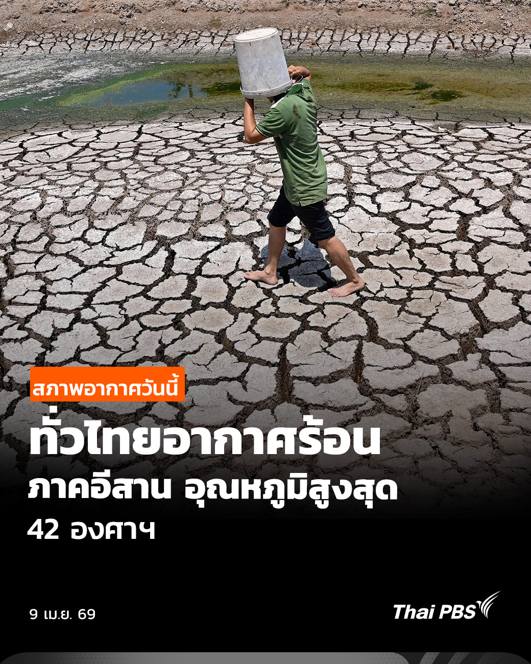 วันนี้ (9 เม.ย.69) กรมอุตุนิยมวิทยา พยากรณ์อากาศ 24 ชั่วโมงข้างหน้า ประเทศไทยตอนบนมีอากาศร้อนโดยทั่วไปและมีอากาศร้อนจัดบางพื้นที่ กับมีฟ้าหลัวในตอนกลางวัน เนื่องจากความกดอากาศต่ำ เนื่องจากความร้อนปกคลุมประเทศไทยตอนบน ในขณะที่มีลมใต้ และลมตะวันตกเฉียงใต้กำลังอ่อนพัดปกคลุมในบริเวณดังกล่าว ทำให้ประเทศไทยตอนบนมีฝนฟ้าคะนองกับมีลมกระโชกแรงบางแห่ง ขอให้ประชาชนดูแลรักษาสุขภาพเนื่องจากสภาพอากาศที่ร้อนถึงร้อนจัด โดยหลีกเลี่ยงการทำงานหรือการประกอบกิจกรรมในที่โล่งแจ้งเป็นระยะเวลานาน รวมทั้งระวังอันตรายจากฝนฟ้าคะนองที่อาจเกิดขึ้นได้บางพื้นที่ไว้ด้วย