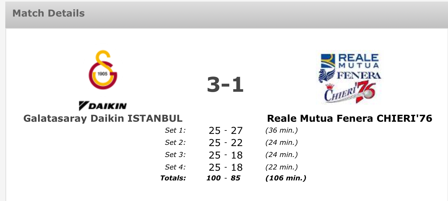 Galatasaray Daikin Istanbul 3-1 Reale Mutua Fenera Chieri’76 (25-27 25-22 25-18 25-18)