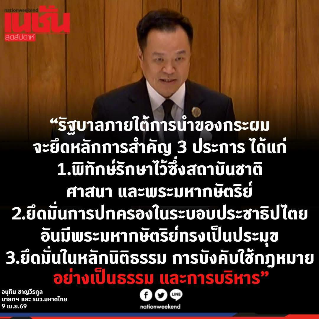 “รัฐบาลภายใต้การนำของกระผม จะยึดหลักการสำคัญ 3 ประการ ได้แก่ 1.พิทักษ์รักษาไว้ซึ่งสถาบันชาติ ศาสนา และพระมหากษัตริย์ 2.ยึดมั่นการปกครองในระบอบประชาธิปไตยอันมีพระมหากษัตริย์ทรงเป็นประมุข 3.ยึดมั่นในหลักนิติธรรม การบังคับใช้กฎหมายอย่างเป็นธรรม และการบริหาร”