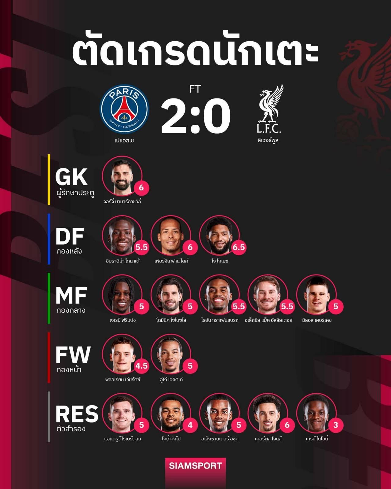 จดหมายเหตุจากปารีส ตัดเกรดผู้เล่นหงส์แดงที่สอบตกทั้งคณะในเกมบุกพ่ายเปแอสเช 2-0