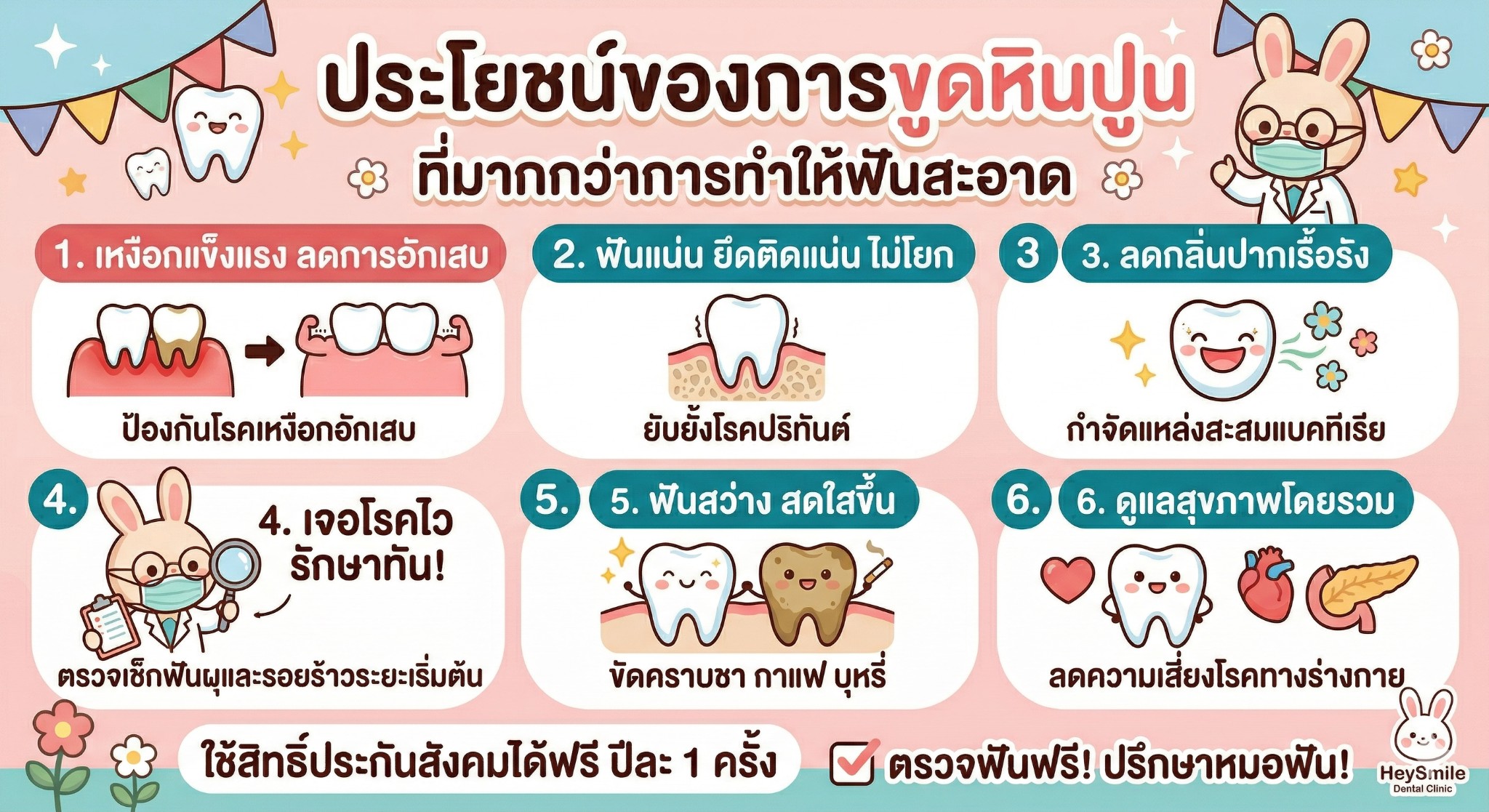 หินปูนคือตัวการปล่อยสารพิษทำลายเหงือก การขูดหินปูน จะไปตัดวงจรการเกิดโรคปริทันต์ (รำมะนาด) แถมตอนทำ หมอจะได้ช่วยเช็กฟันผุระยะเริ่มต้นให้ด้วย รักษาไวก่อนลุกลามครับ