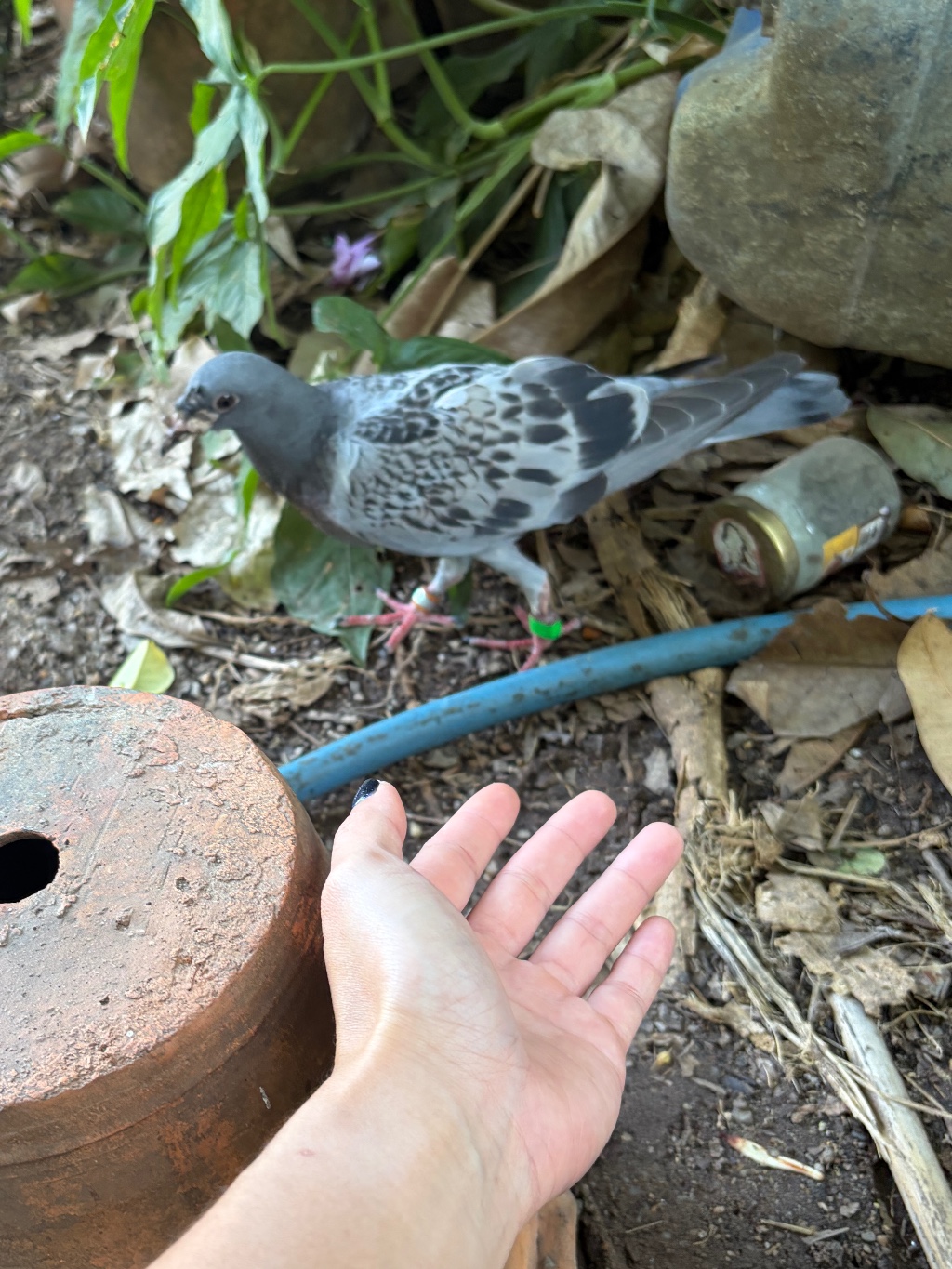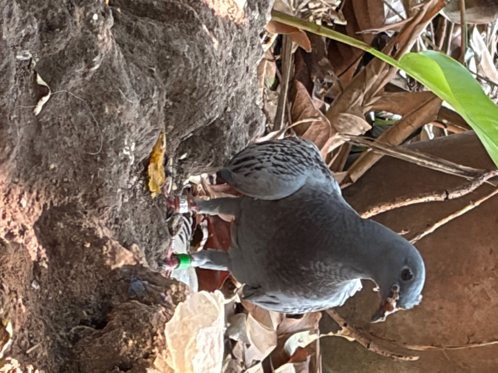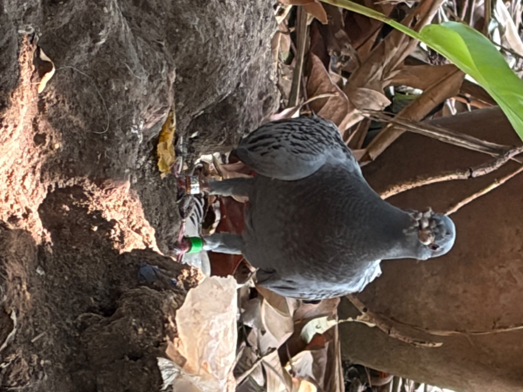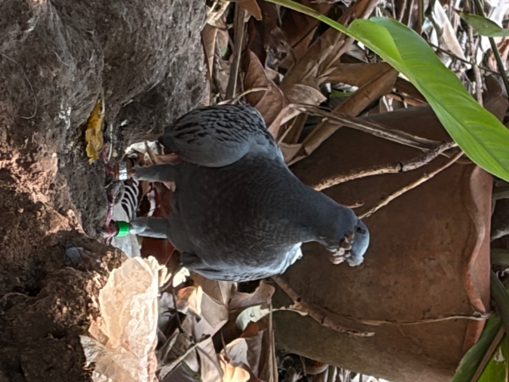 พอดีออกมาข้างบ้าน แล้วเจอนกพิราบ1 ตัว ทีแรกก็สงสัยเพราะปกติแถวบ้านไม่มีนกพิราบเลย พอสังเกตอีกทีนกมีห่วงที่ขาสองข้าง กำลังเดินหาอะไรกิน เชื่องมาก ไม่บินหนี แต่พยายามสังเกตแล้ว ไม่มีตัวอักษรอะไรสลักที่ห่วง เป็นแค่ห่วงสีเขียวและสีเงินๆ อยากทราบว่านกแบบนี้เค้าใช้ทำอะไร ไม่เคยเห็นเลยค่ะ
