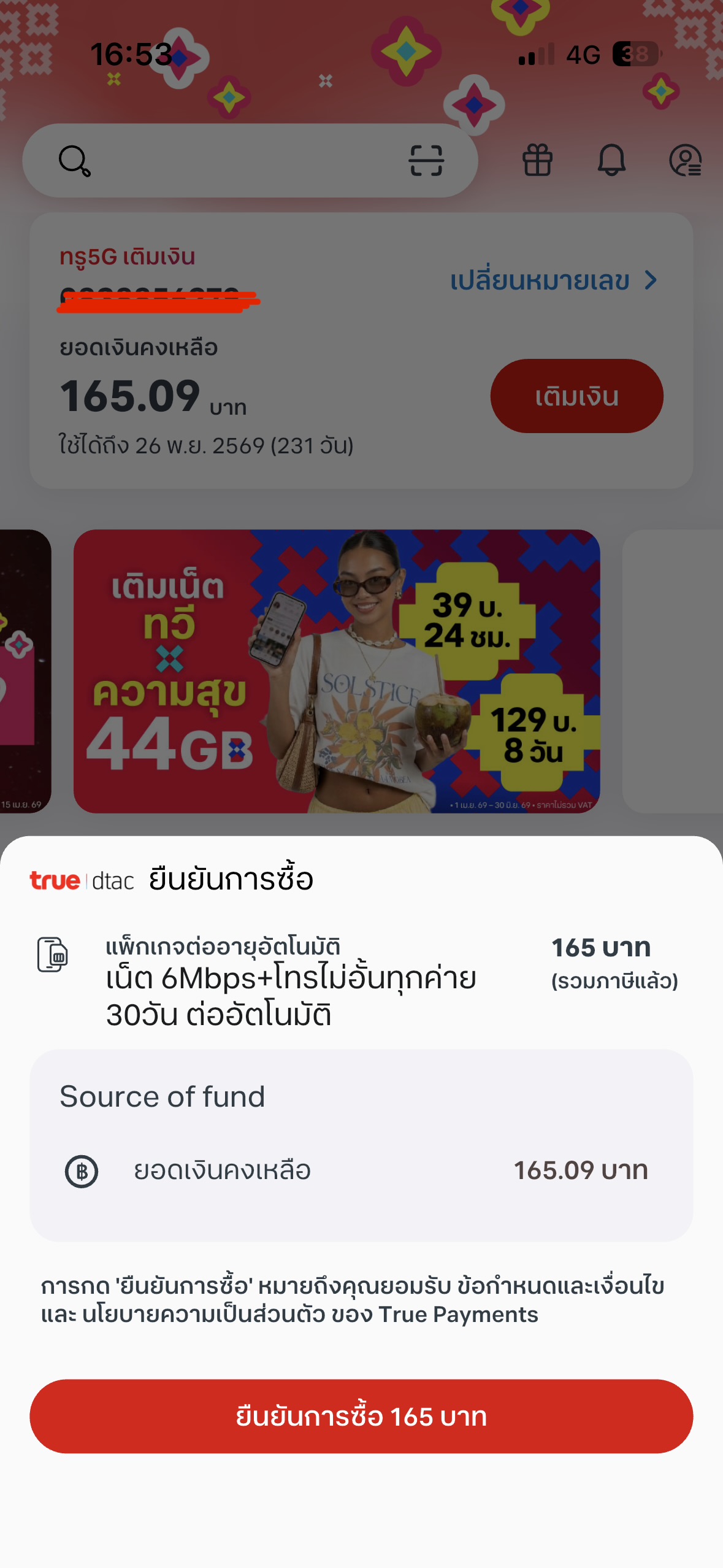 ในแอพทรูขึ้นแนะนำโปรขึ้นมาตามรูป ผมจึงโอนเงินเข้าไป แต่พอกดสมัครกลับสมัครไม่ได้ รู้สึกไม่ได้รับความเป็นธรรมรบกวนช่วยเหลือด้วยครับ