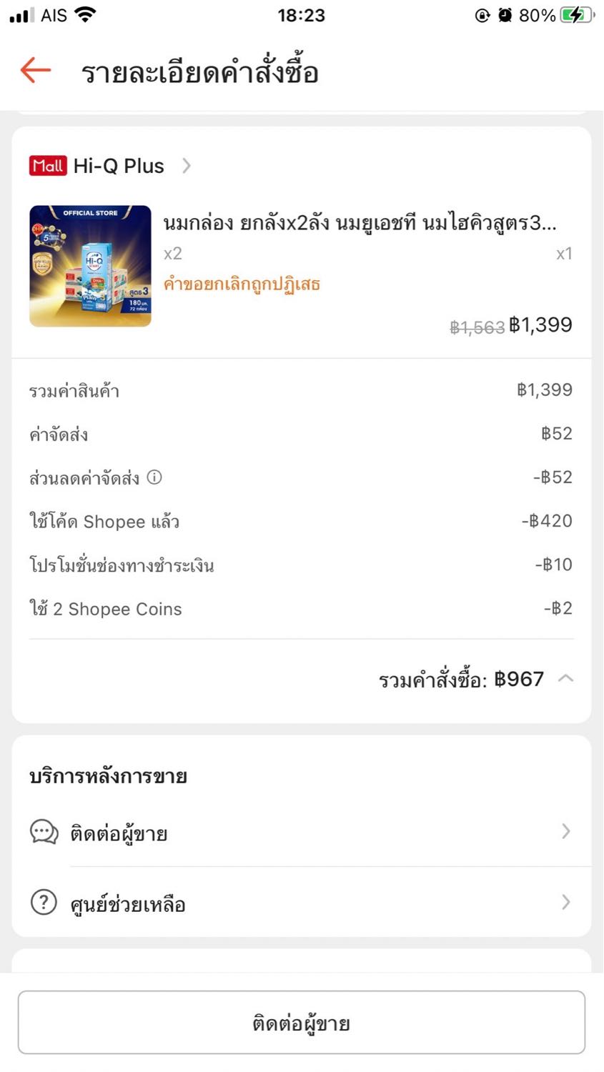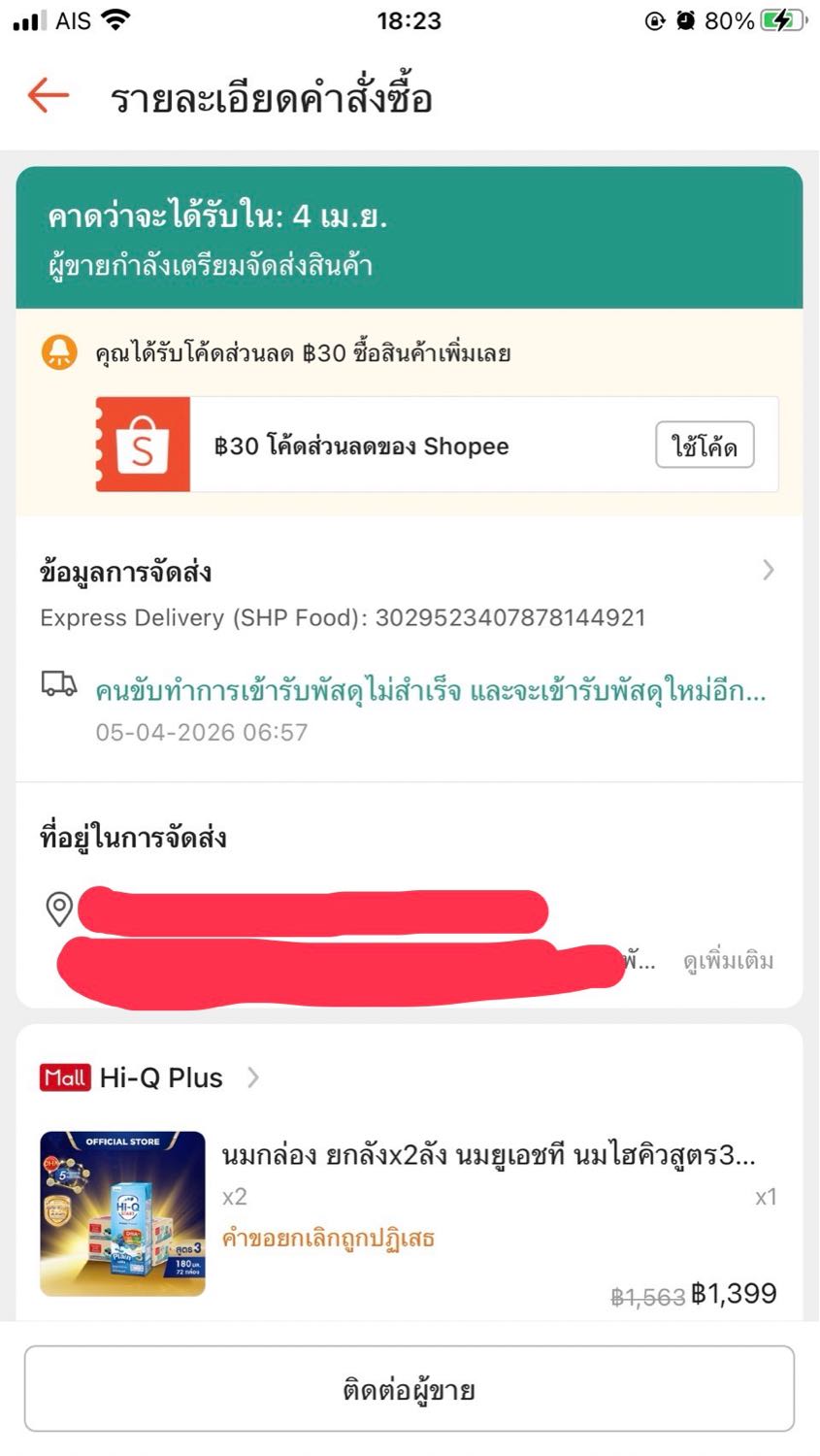เราได้สั่งซื้อนม Hi Q ผ่าน แอฟ shopee เมื่อวันที่ 4/4/2569 จนถึงเวลานี้ยังไม่ส่งเลยซึ้ฃมันช้าเกินไป ถามไป แอฟ shopee ก็ให้เราติดต่อร้าน
