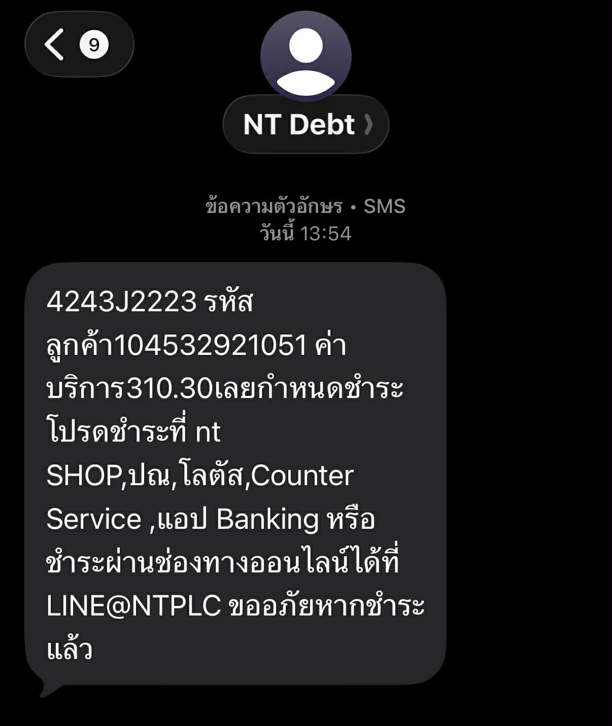 อยู่ๆก็มีข้อความส่งมาไม่รู้มาไงบอกว่า "NT Debt 12:10 น. 7436J1122 รหัสลูกค้า104533610688 ค่า บริการ278.20เลยกำหนดชำระ โปรดชำระที่ nt SHOP,ปณ, โลตัส, Counter Service, แอป Banking หรือชำระผ่านช่อ
