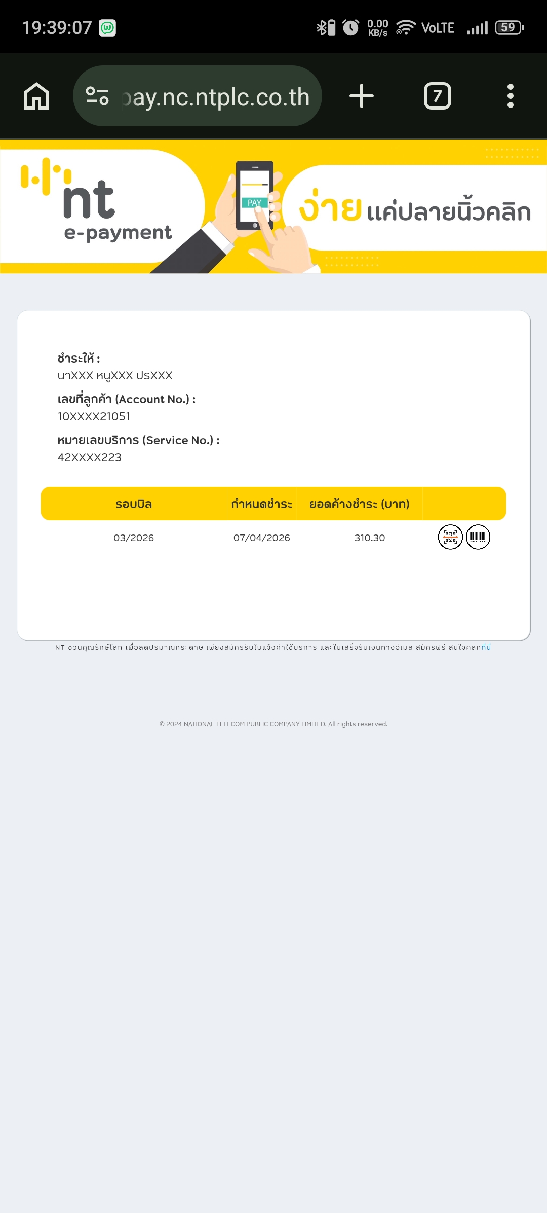 มันขึ้นแบบนี้ค่ะ 3554J6552 ค่าบริการ749.00เลยกำหนดชำระ โปรดชำระที่ nt SHOP,ปณ,โลตัส,Counter Service ,แอป Banking ขออภัยหากชำระแล้ว