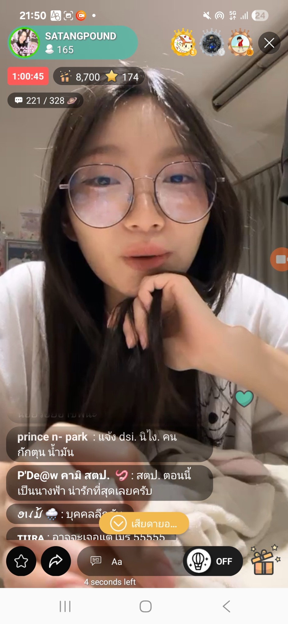 มาดู โอชิ,live พร้อมกันสามคน. มือถือ 3 เครื่อง พอดี. น้อง เพลินดื้อ นีญ่า. Satangpound. นีญ่าทำทรงผมใหม่ มองข้างๆตะกี้