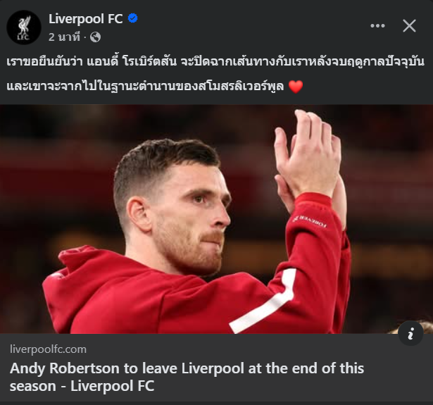 เพจ Official Liverpool ได้ประกาศ Robertson จะลาทีมหลังจบฤดูกาลนี้
