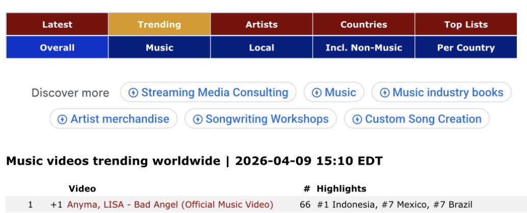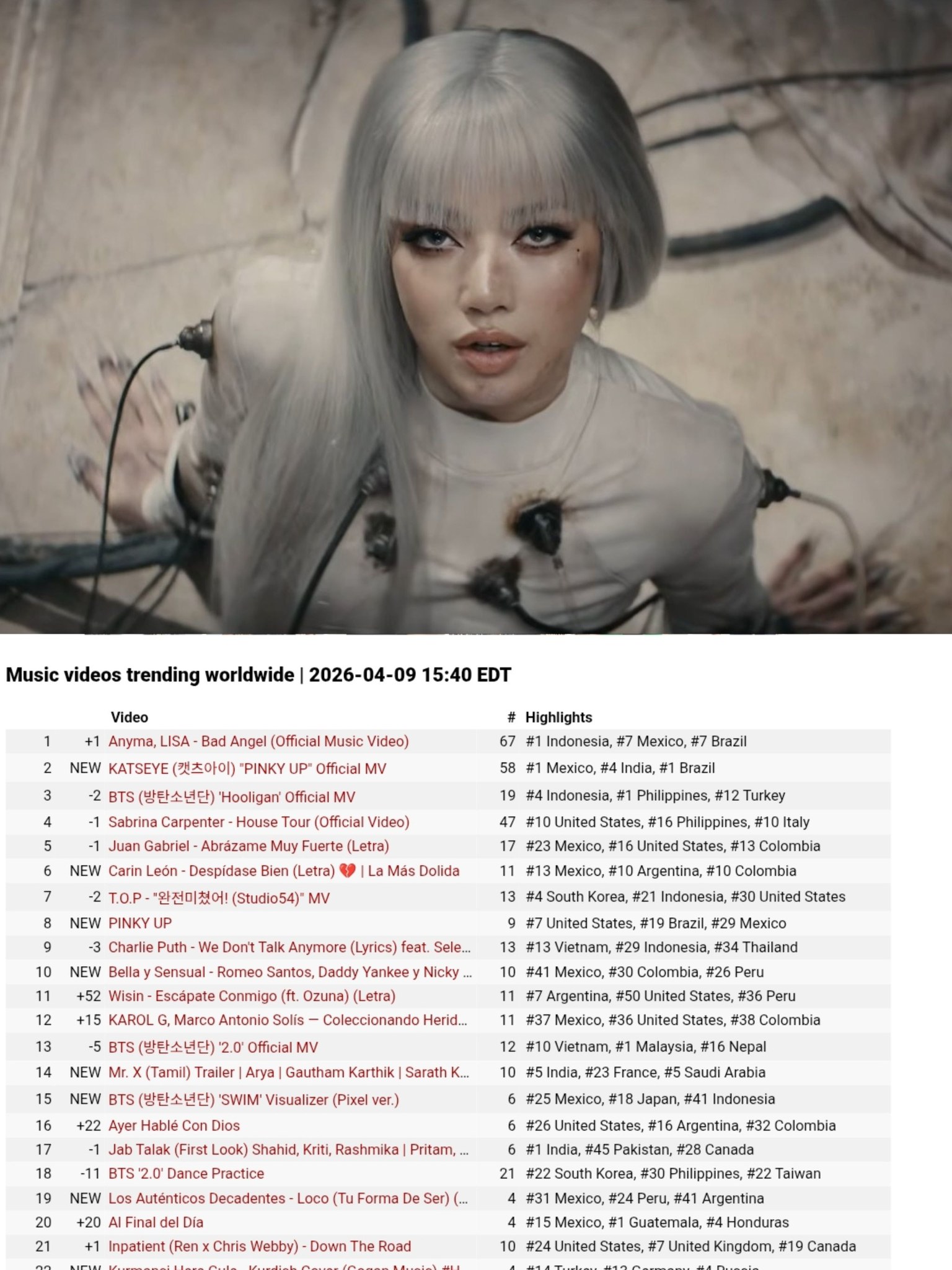 260410 - #LISA - ข่าวประจำวัน - Bad Angel MV ขึ้นเป็นวิดีโอยอดนิยมอันดับ 1 บน Youtube ทั่วโลก